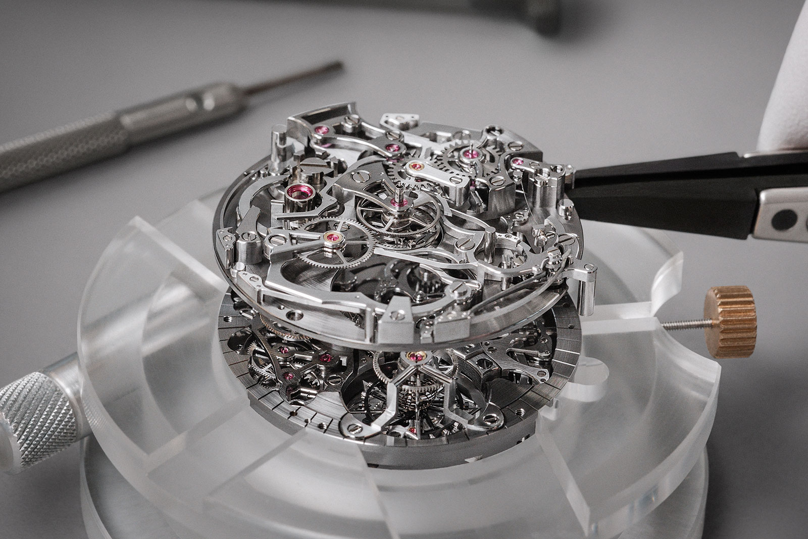 An evolution (and stylistic upgrade) of the solid-dial Les Cabinotiers Minute Repeater Tourbillon Split-Seconds from 2022, the Temporis is underpinned by a base movement that features a minute repeater and tourbillon; on top sits a traditionally constructed split-seconds chronograph mechanism that is paired with the calibre in an unconventional manner.