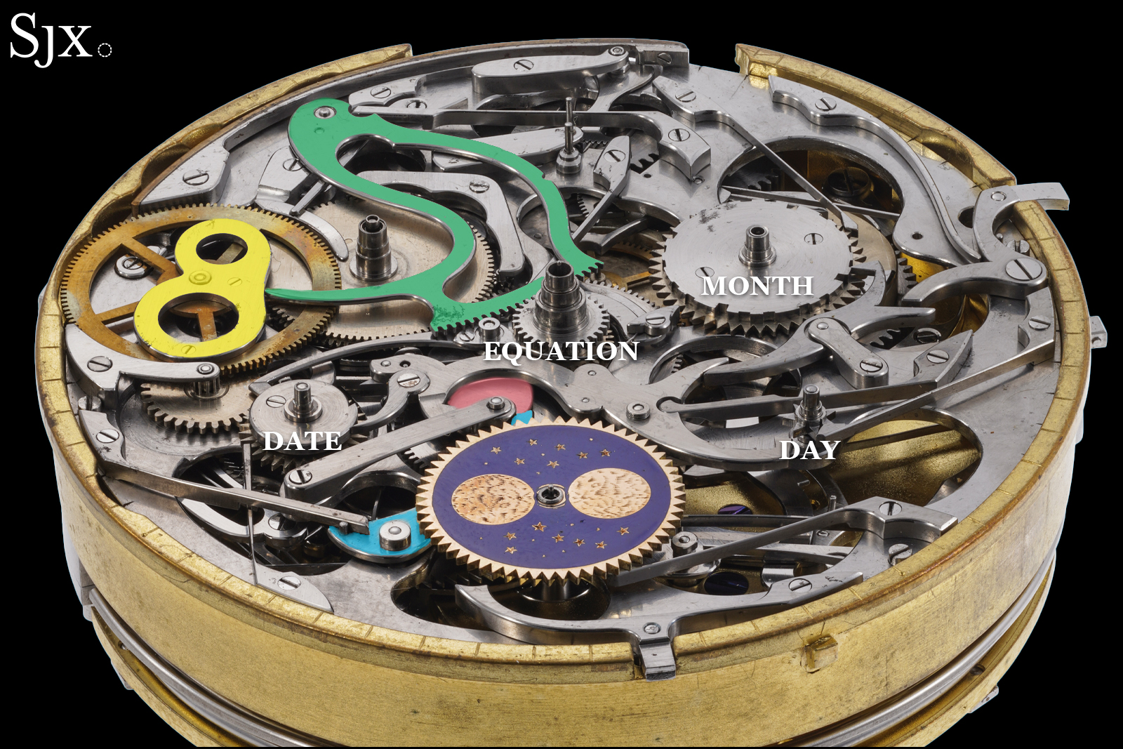 Pressing the tab at three o’clock advances the day, date, month, leap year, and equation of time in sync, while the tab near six o’clock adjusts the moon phase individually. There is no quick correction for just the month, as that would de-synchronise the equation of time, which is controlled by the large kidney shaped cam (yellow) and read by a spring loaded rack (green). You can also spot a bimetallic strip for the thermometer from 10 to 12 o’clock.