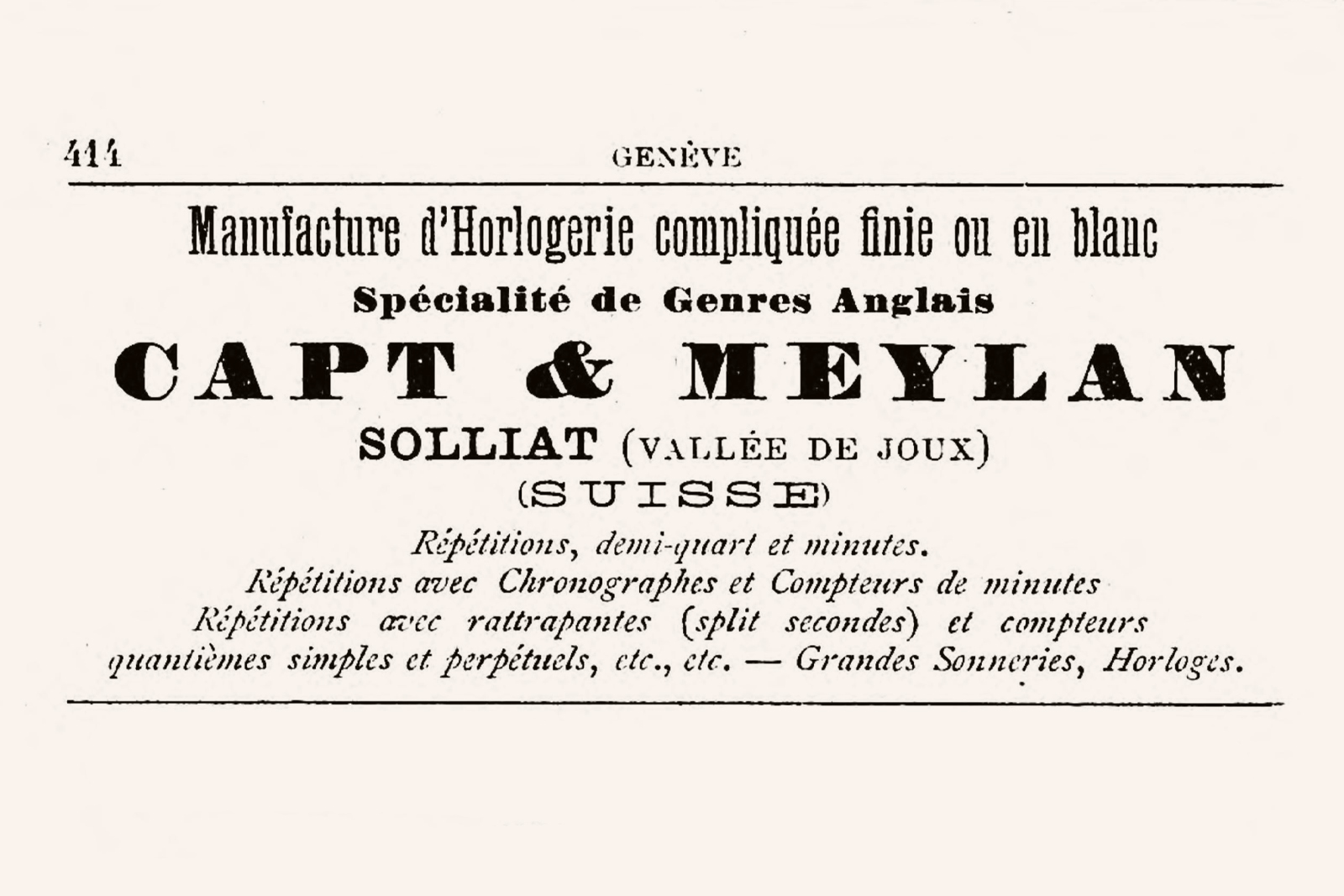 Advertisement in Indicateur Davoine by Capt & Meylan (later Capt & Co) circa 1900. Meaning in English, “Manufacturer of complicated watches and ebauches, specializing in the English style”. Image – Indicateur Davoine 1900