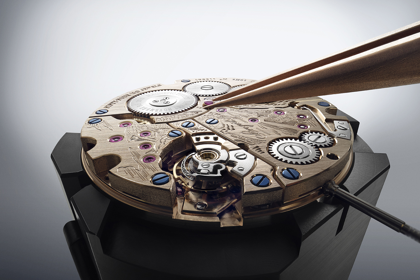 Display aside, the cal. 74SC inside is fundamentally the same as the cal. 574DR in the 7727, retaining the key feature of the magnetic-pivot balance. The balance staff “floats” in place thanks to opposing magnetic forces, leaving only the tip of the pivots in contact with jewelled bearings, minimising friction and allowing for the high frequency rate. The magnetic suspension also gives it improved shock resistance, since the balance jumps back into position even when displaced by shock.