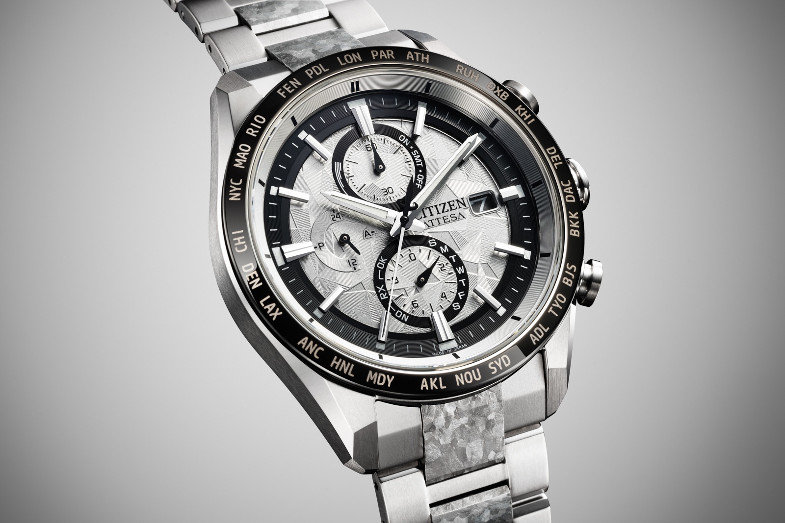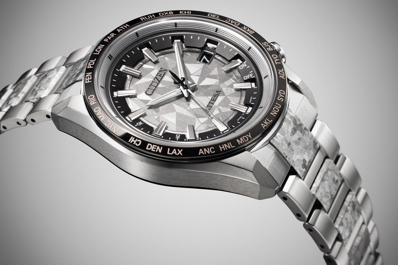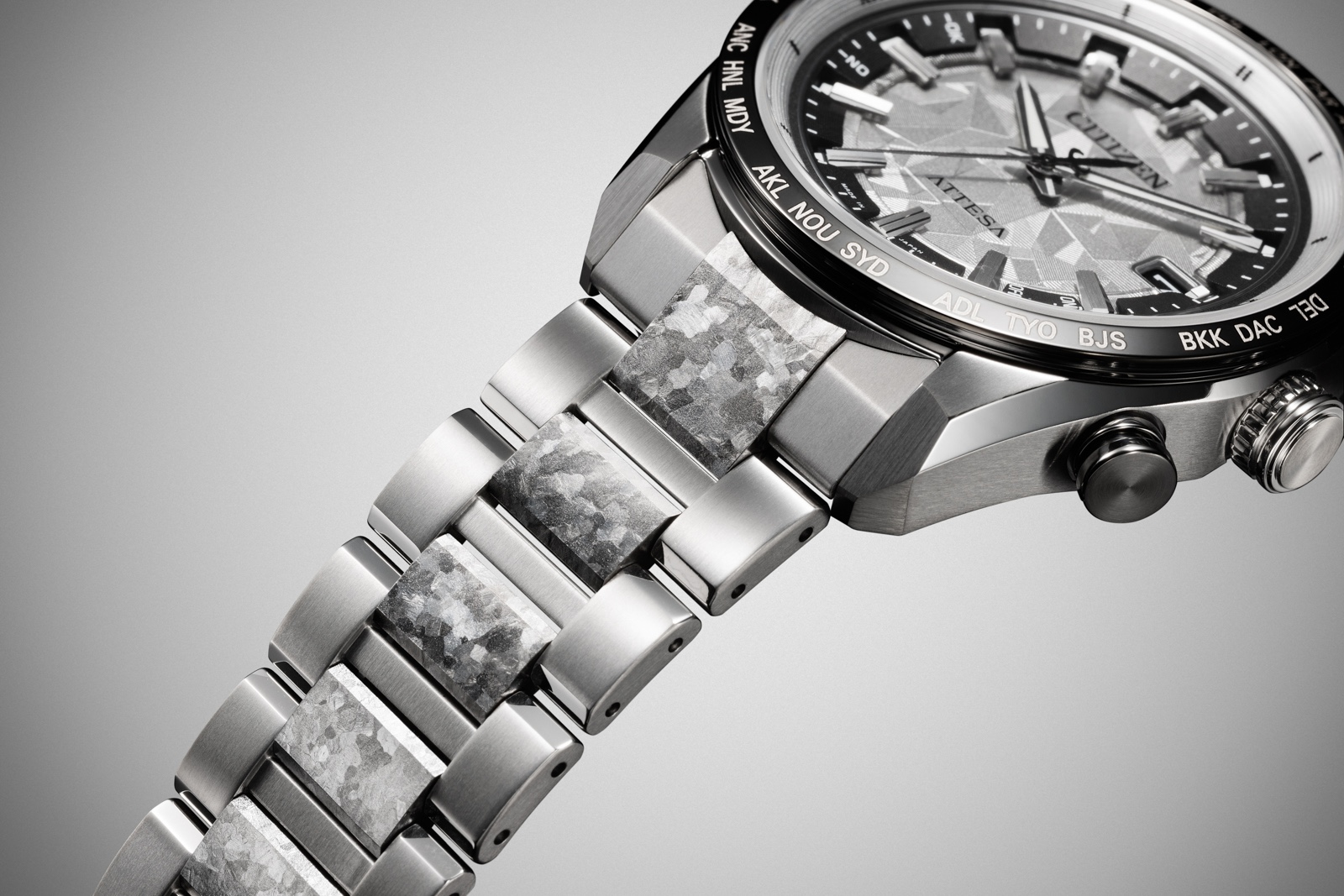 Citizen also makes what is known as recrystallised titanium, in which grade 2 titanium is heat-treated at extremely high temperatures in conjunction with a controlled cooling process. This process results in a surface pattern that is unique to every piece, since the crystals form naturally, similar to the way in which Widmanstätten patterns form in meteorite.
