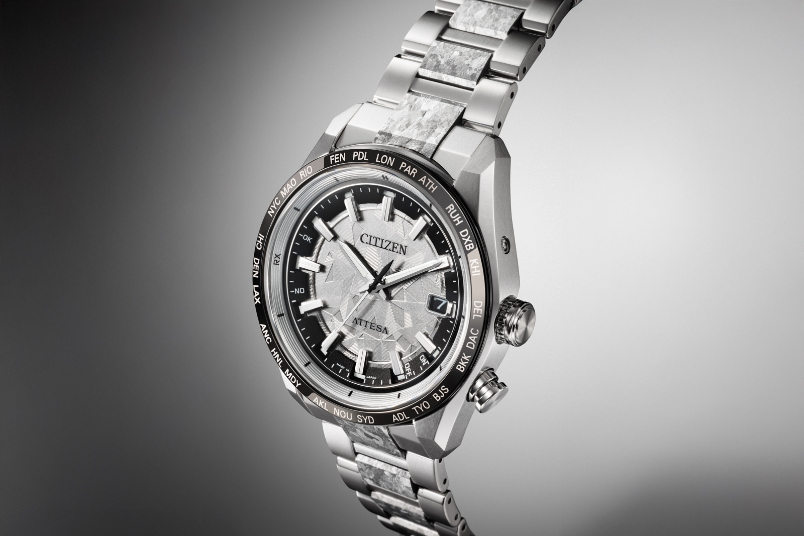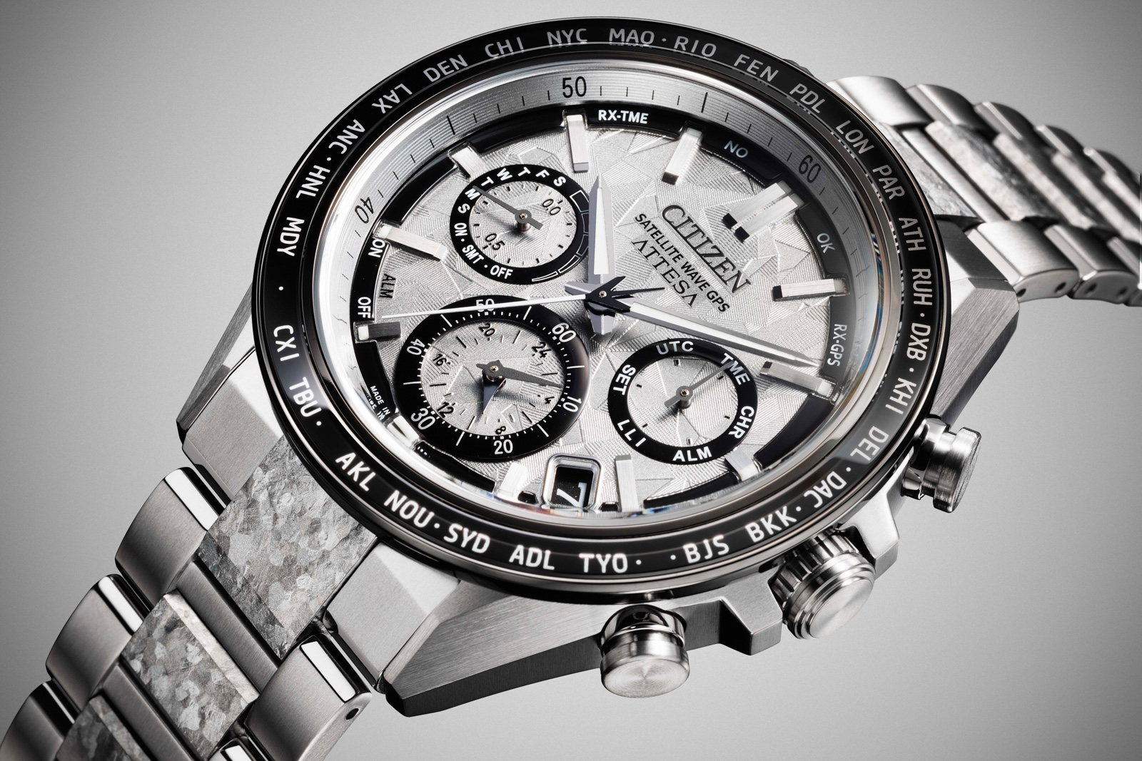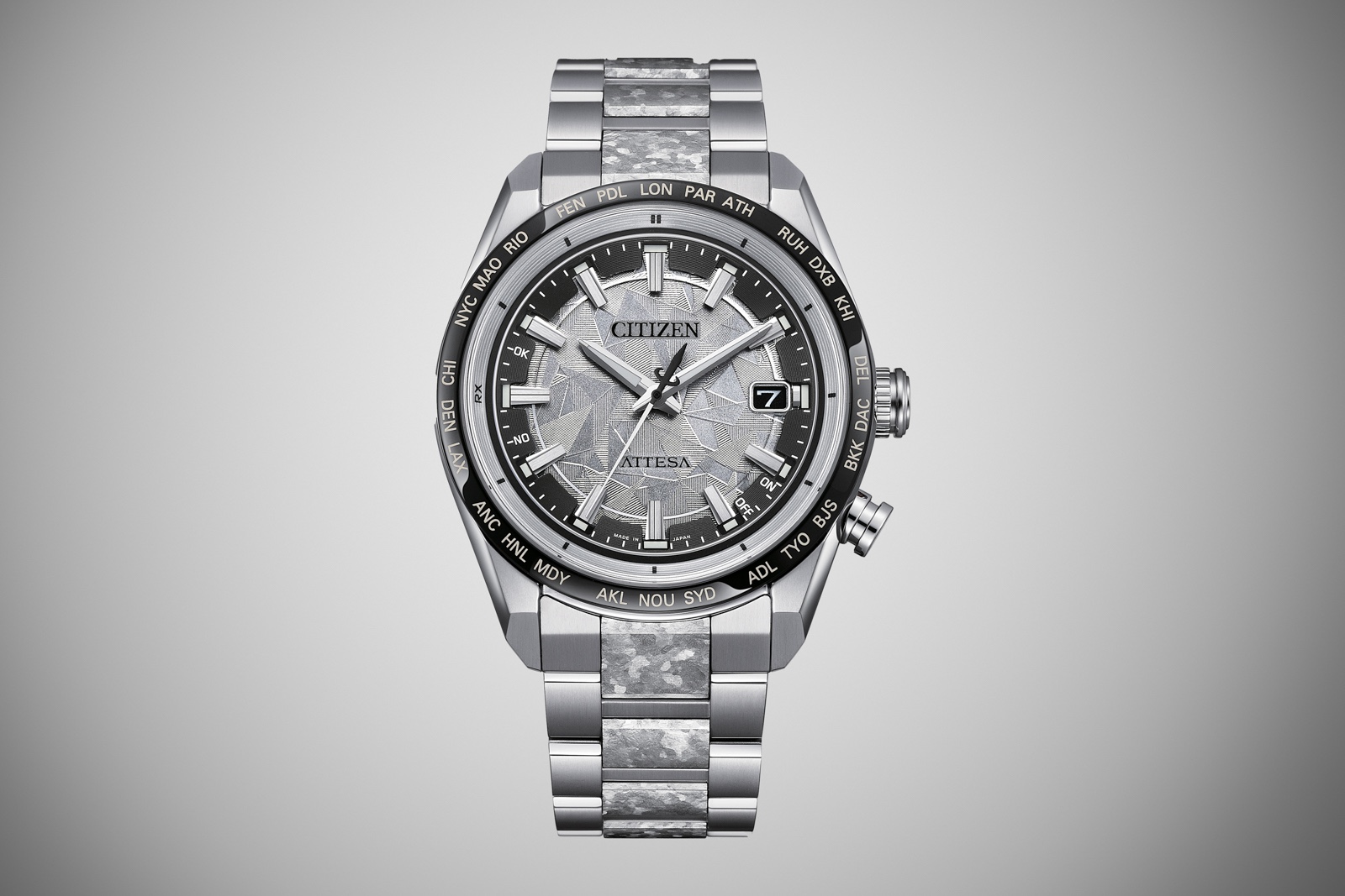 Citizen also makes what is known as recrystallised titanium, in which grade 2 titanium is heat-treated at extremely high temperatures in conjunction with a controlled cooling process. This process results in a surface pattern that is unique to every piece, since the crystals form naturally, similar to the way in which Widmanstätten patterns form in meteorite.