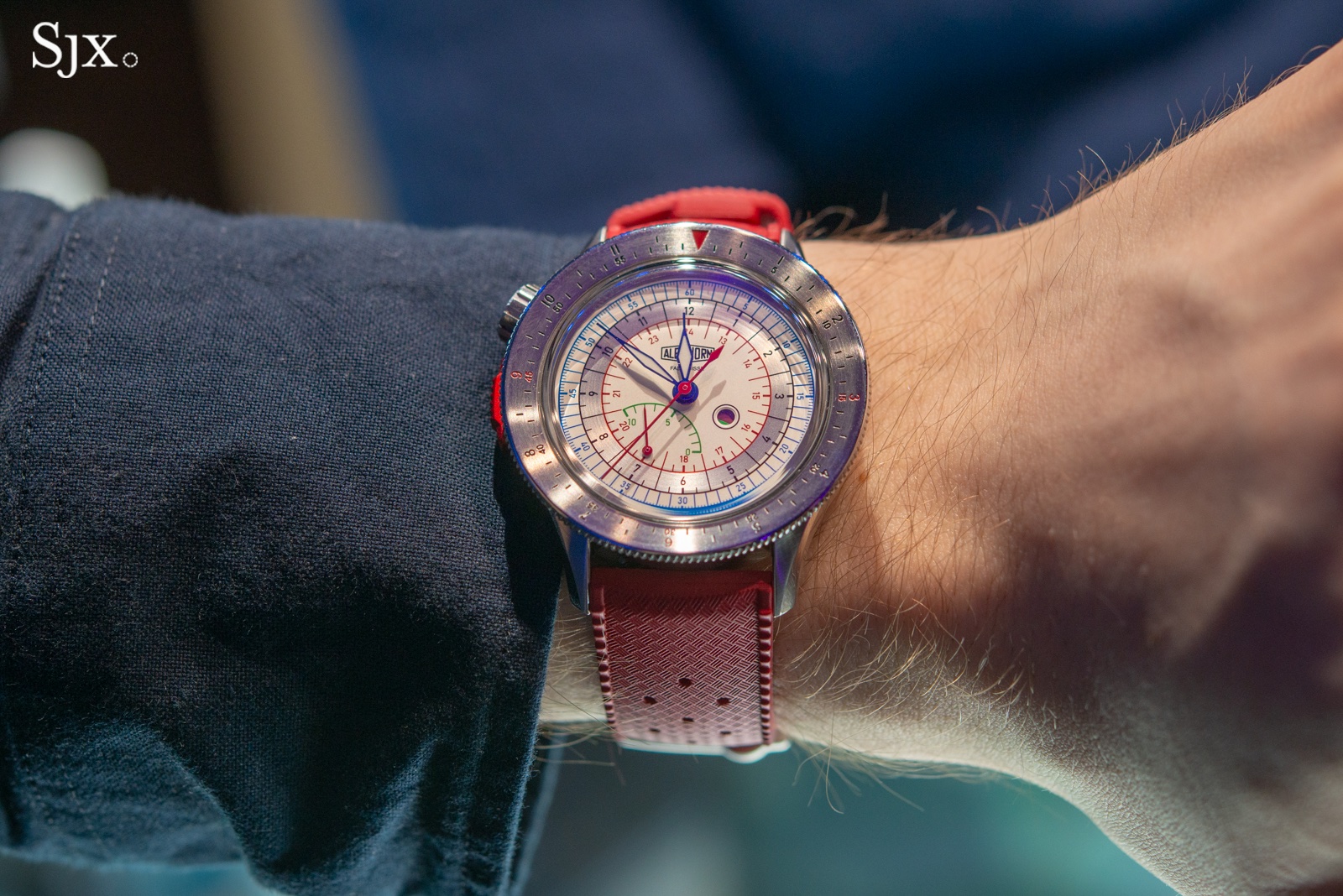 I’ve written extensively about Albishorn, covering each of the brand’s models to date, but this was my first time going hands-on with the Maxigraph, a collaboration with Massena LAB. The movement traces its roots to the Valjoux cal. 7750, but founder Sébastien Chaulmontet redesigned it for better tolerances, substantially reducing the movement’s thickness and improving the feel of the chronograph monopusher (relocated to the nine o’clock position).