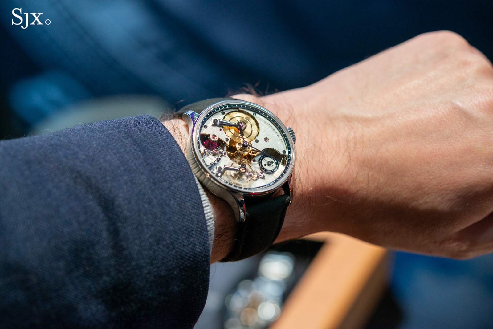 Another watch making its public debut was the Urwerk UR-10 Spacemeter. Co-founder Martin Frei was on hand to explain his latest design, which tracks Earth’s rotation and revolution. The UR-10 has a lot in common with the UR-100, featuring the same base movement and a similar tapered titanium bracelet. Beyond the intriguing functionality, the silky lightweight bracelet is a standout feature.