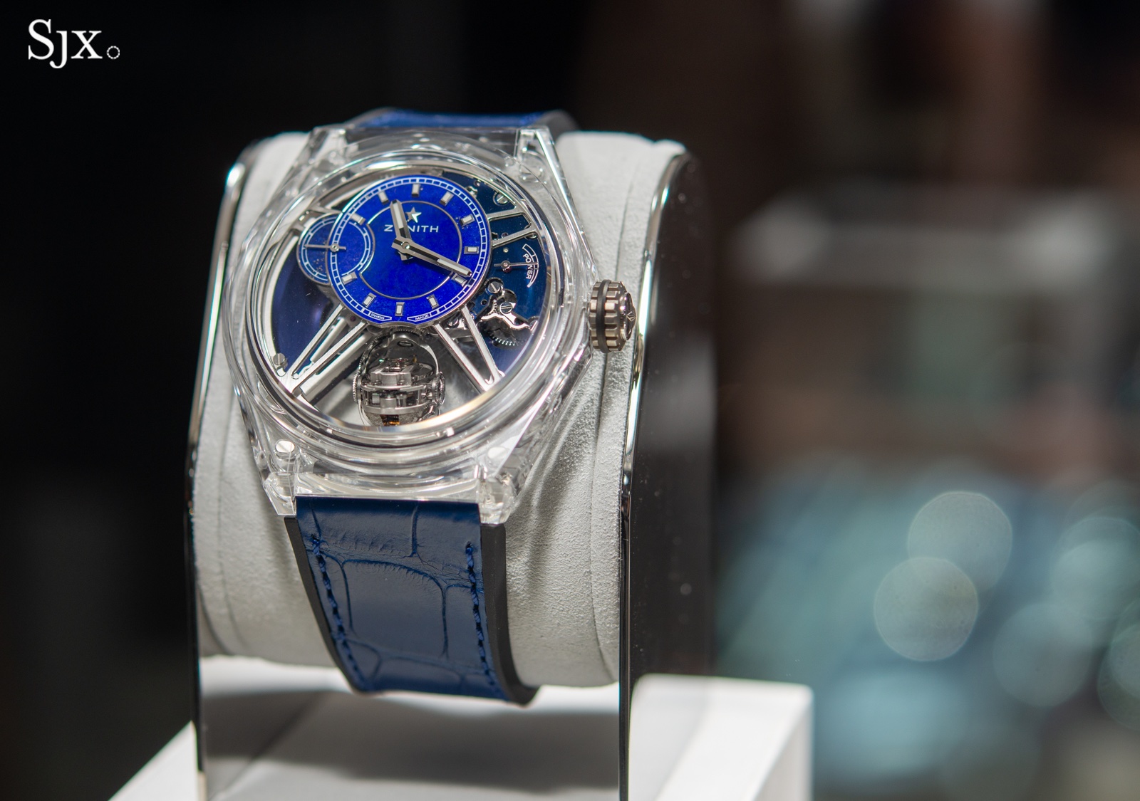 Another new product making its public debut was the Zenith Defy Zero G, which features a sapphire crystal case and the brand’s gimbaled escapement, which keeps the balance parallel to the ground at all times. Serving somewhat the opposite function of the tourbillon, the Gravity Control escapement module keeps the oscillator in a stable position, simplifying adjustment.