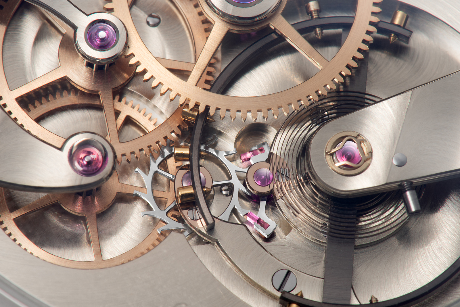 There are just two main bridges and one cock: the one that secures the barrel, an intricate C-shaped bridge securing the bulk of the going train, and the balance cock. Much like with Potter’s movement, the escape wheel gets its own finger bridge, with a gold-capped jewel. The escapement lever is similarly anchored.