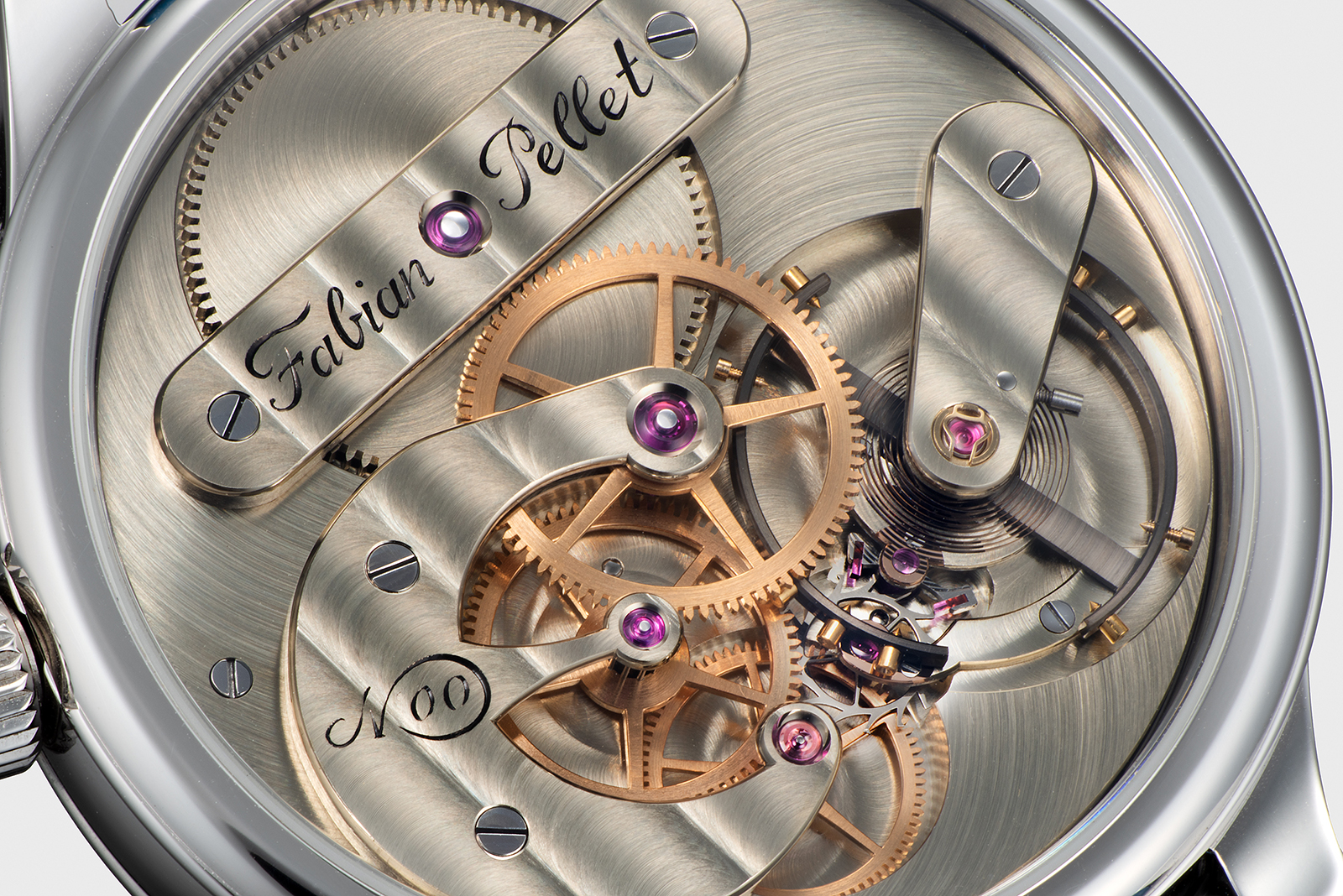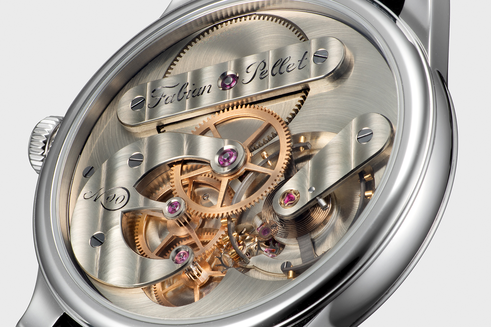 The movement inside the watch is clearly meant to be the center of attention, thoughtfully hidden underneath the simple, pocket watch-like dial. The calibre was crafted fully by hand; Mr Pellet does not use CNC machines even for the cutting of the raw blanks for the mainplate and bridges. The movement is clearly heavily influenced by a historical watches, both visually and in terms of its construction, which adds to its flair.