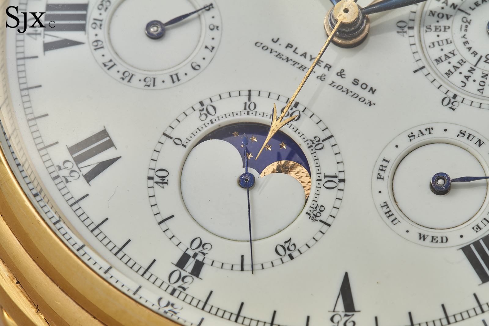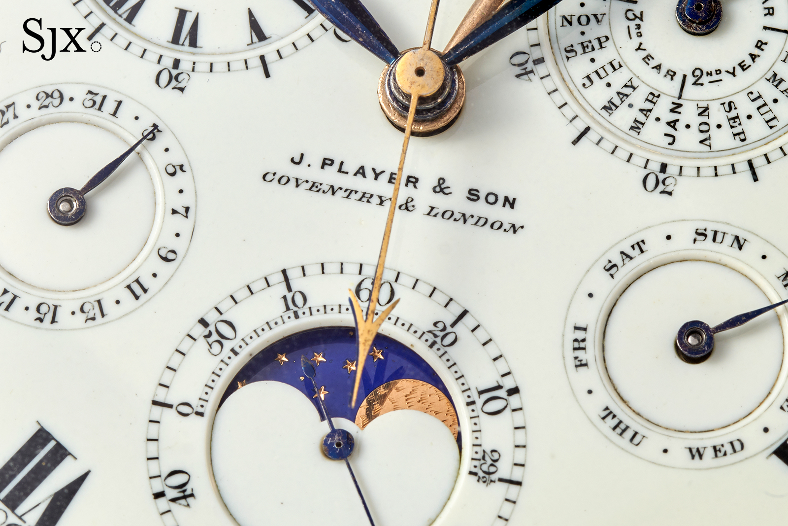 The lettering is hand painted, and intentional. The month sub-dial uses serifed letters for every month except January to mark the new year. The lettering also shifts styles to add emphasis, such as the sans-serif J. Player & Son signature, and “before” and “after” on the equation of time arc.