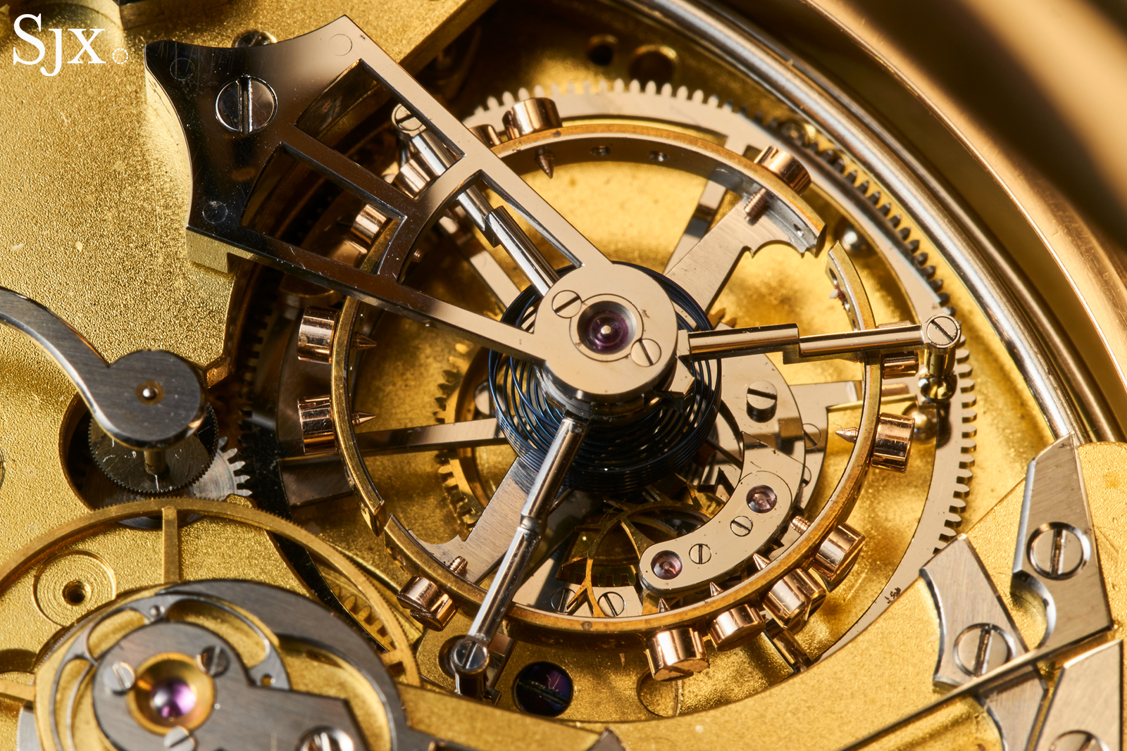 A massive, gilt, three quarter plate conceals most of the movement, as is the English way, drawing all focus to the enormous tourbillon. The tourbillon subassembly is approximately 20 mm in diameter, larger than many entire movements.