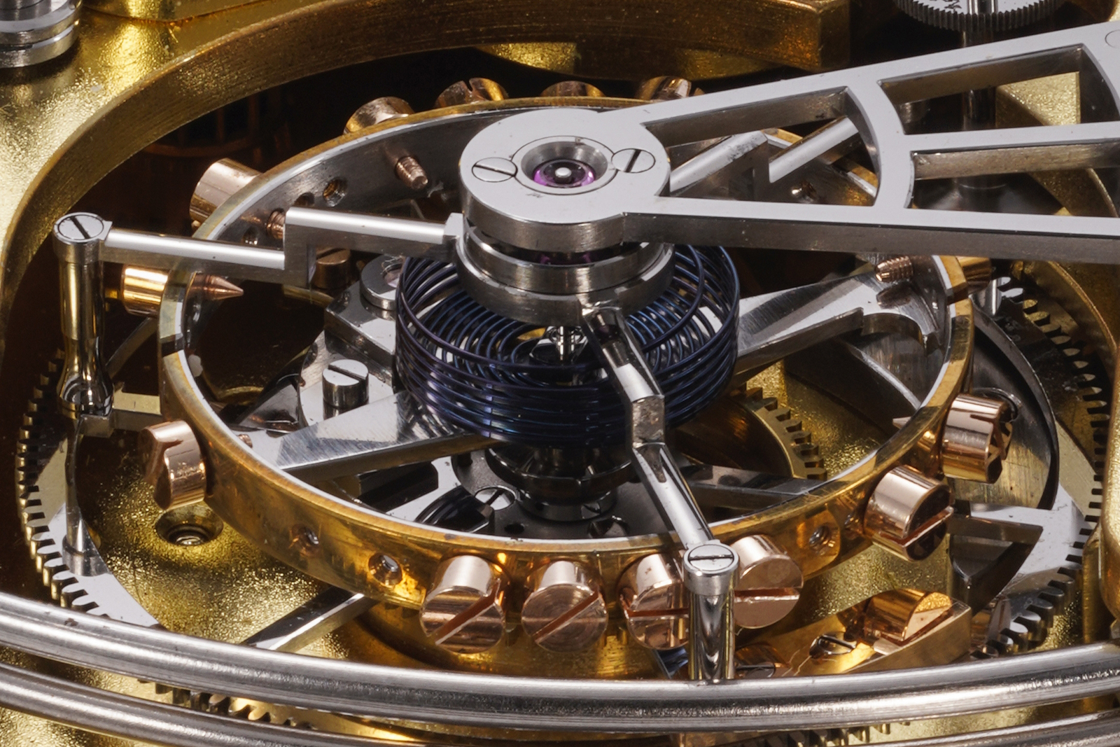 The anchor appears unjeweled at first glance as the jewels are held in place from the top and bottom, rather than the sides as on Swiss levers. The Germans did the same, though their levers (and escape wheels) were often hardened gold rather than steel. There are cap jewels on both the escape wheel and fork pivots, and a gold weight on the other side of the cage to balance the escapement’s weight. I cannot say for sure without partial disassembly of the tourbillon, but the cap jewels for the balance are possibly diamond.