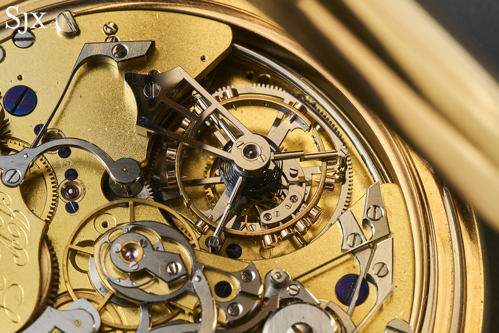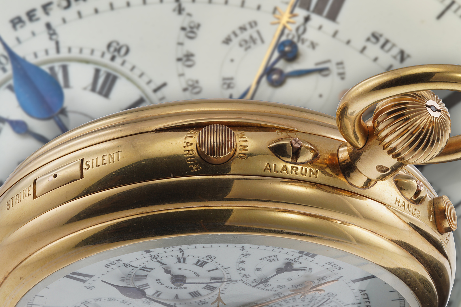 Functions: Hours, minutes, running seconds, grande et petite sonnerie on three gongs, trip minute repeater, tourbillon, alarm, instantaneous perpetual calendar, moon phase, equation of time, split seconds chronograph with 60 minute counter, power reserve, thermometer.