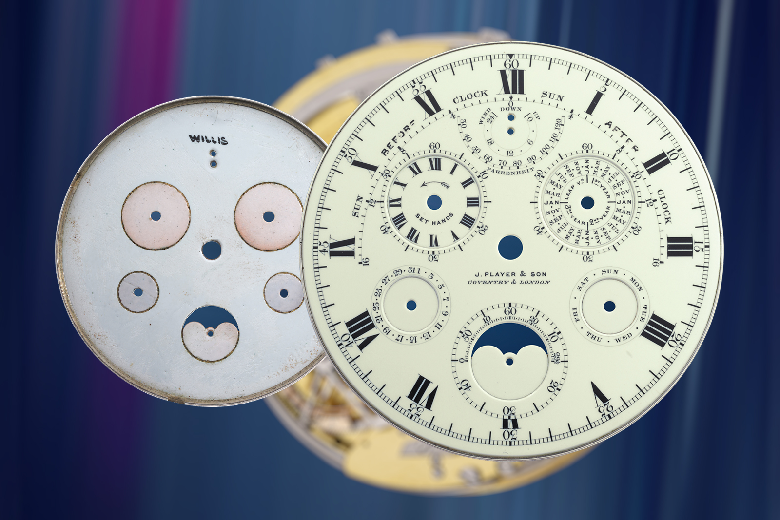 The front and back of the dial, signed “Willis”. Image – Phillips