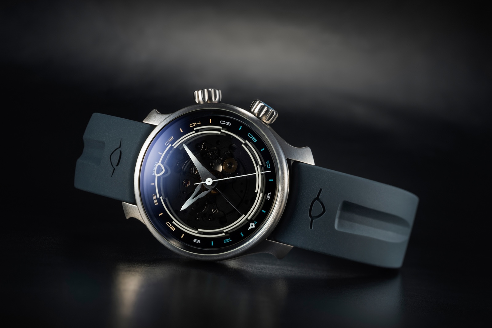 The Odyssey takes the layered look even further by revealing hints of the movement through a smoked sapphire crystal dial. The movement is a typical Sellita GMT calibre, customised for Ming with anthracite-coated plates and open-worked bridges.