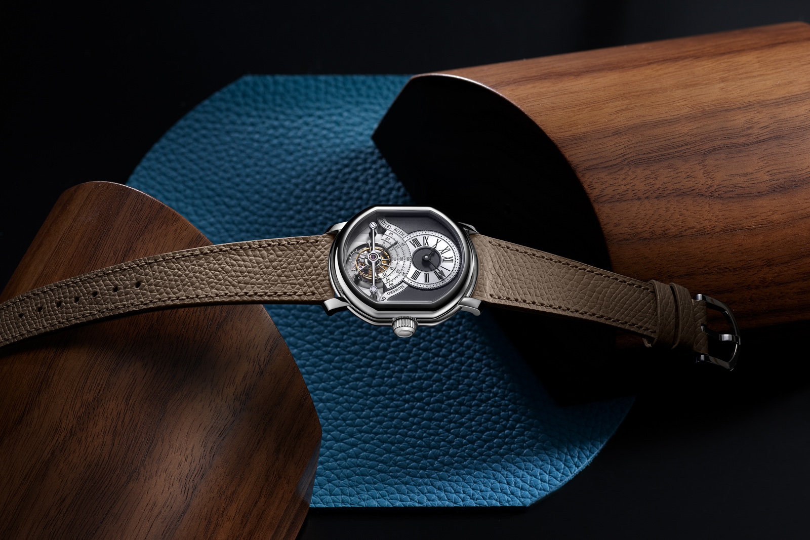 It was also developed with contemporary expectations for finishing in mind, and features all the hallmarks of high-end independent watchmaking. The bridge forms are elegant in their simplicity, and show off vertical striping that echoes the pinstripe guilloche on the dial.