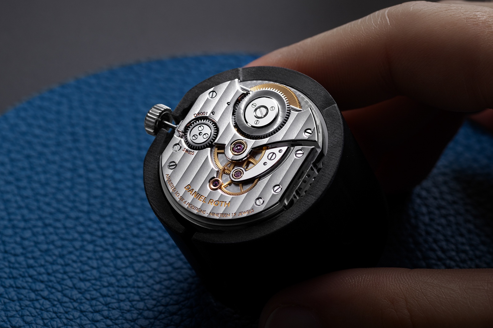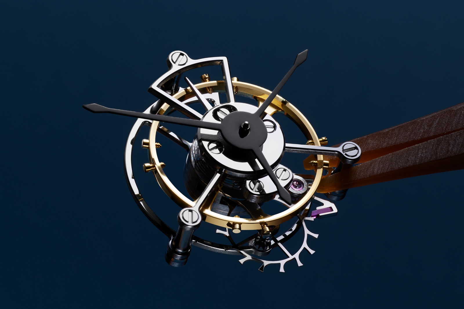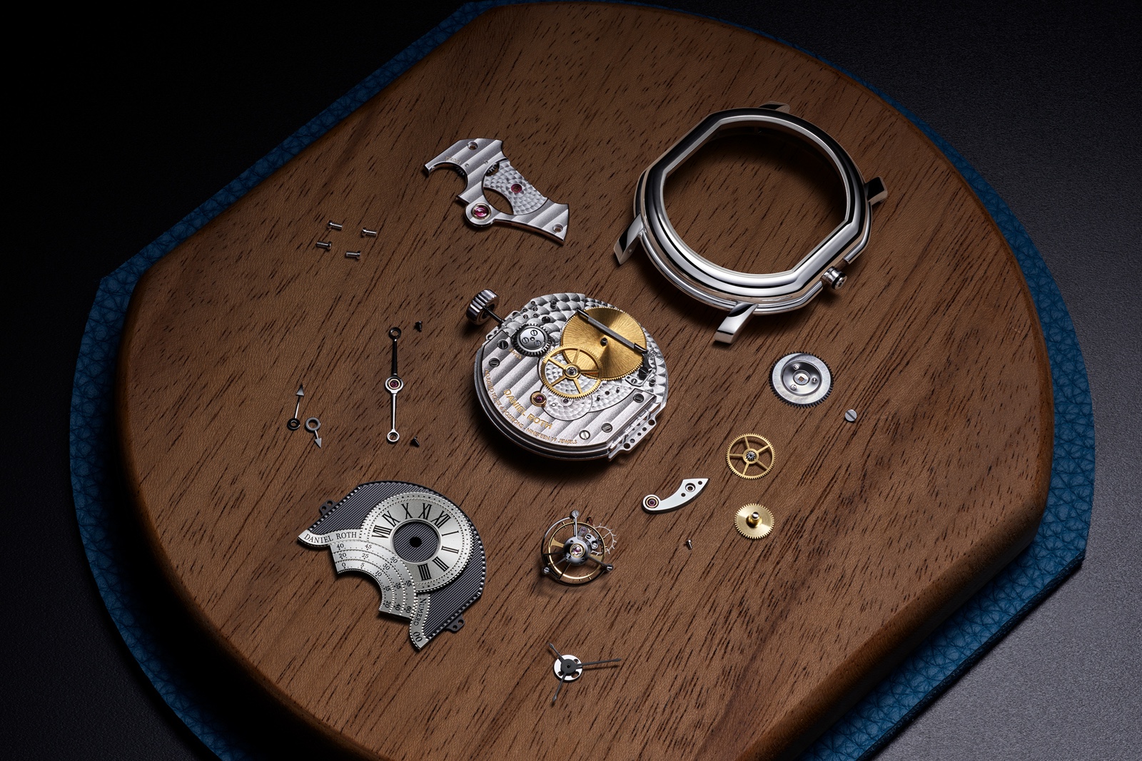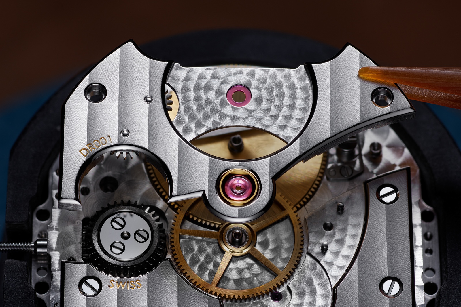 Black-polished steel is used liberally, from the comma-shaped bridge for the third wheel and blade-style click spring on the back, to the rounded bridge for the tourbillon on the front. And the finishing extends beyond what can be seen from the outside; in its disassembled state, the DR001 reveals numerous hidden surfaces treated with pelage and expertly beveled spokes of the train wheels.