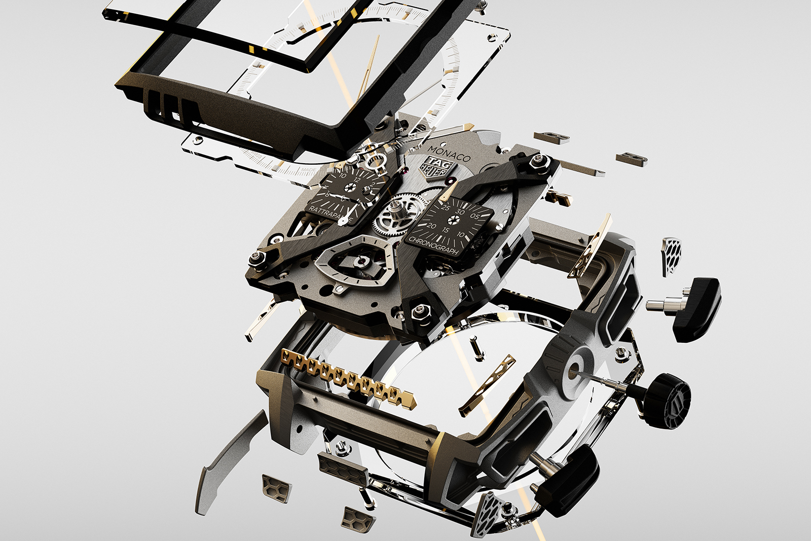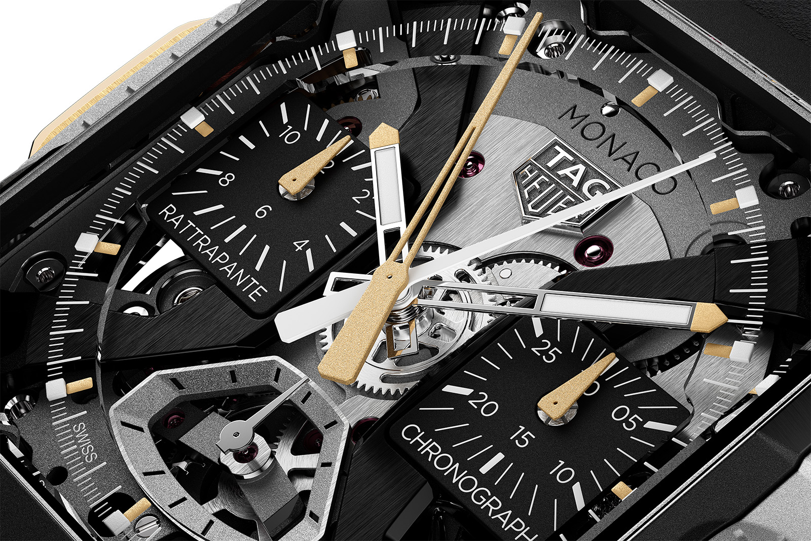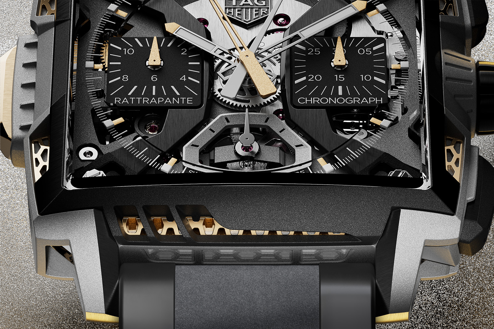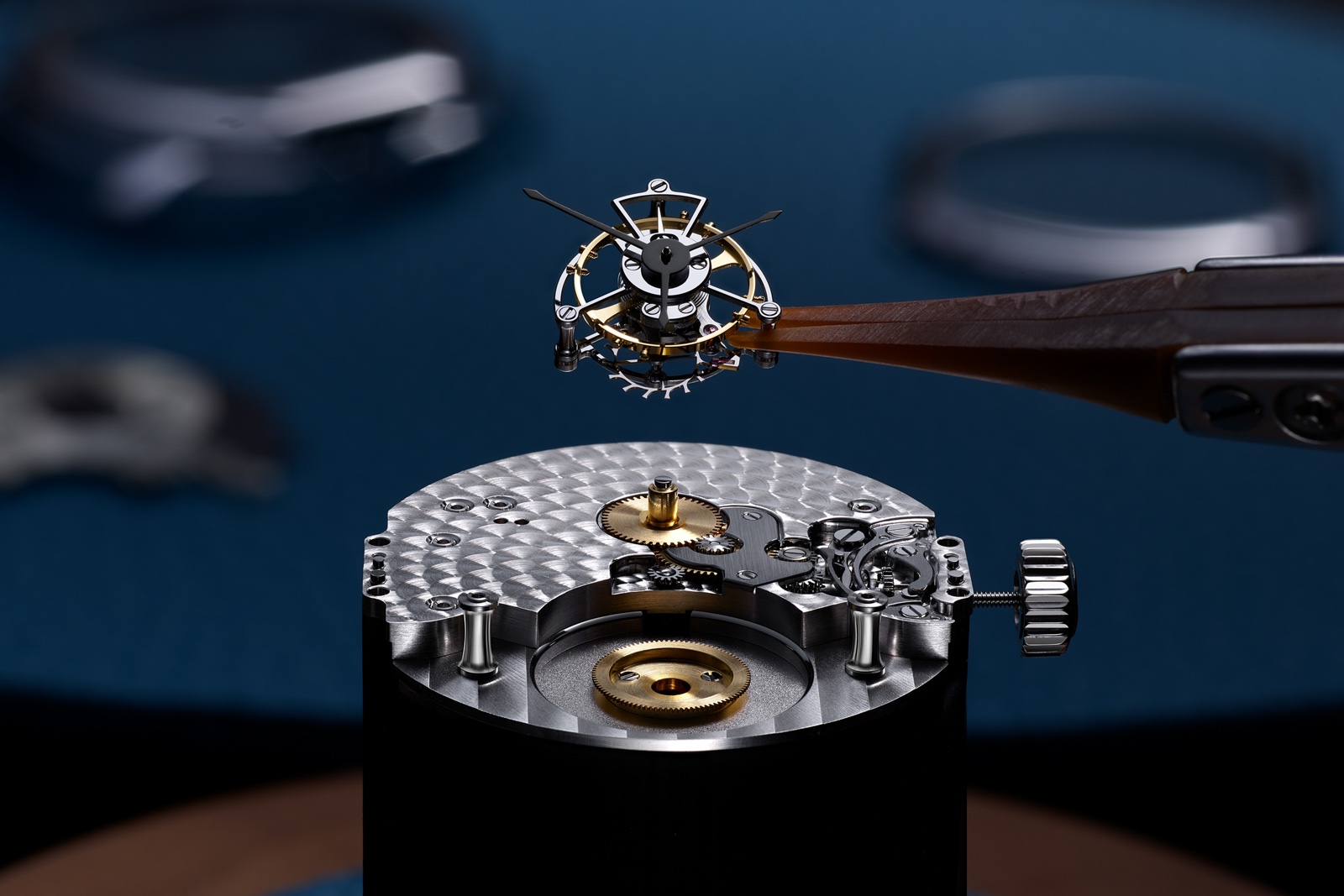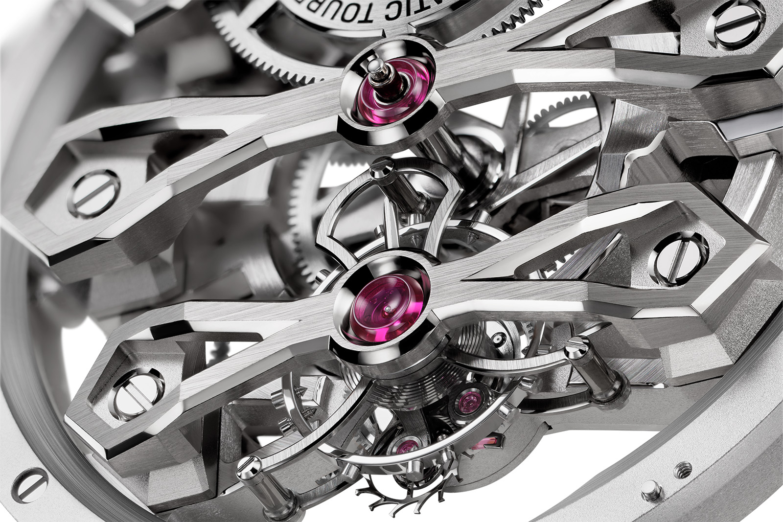The iconic three-bridges design is integral to the movement architecture, with one bridge supporting the barrel and automatic winding works, the second securing the time-telling gear train, and the third carrying the one-minute tourbillon.