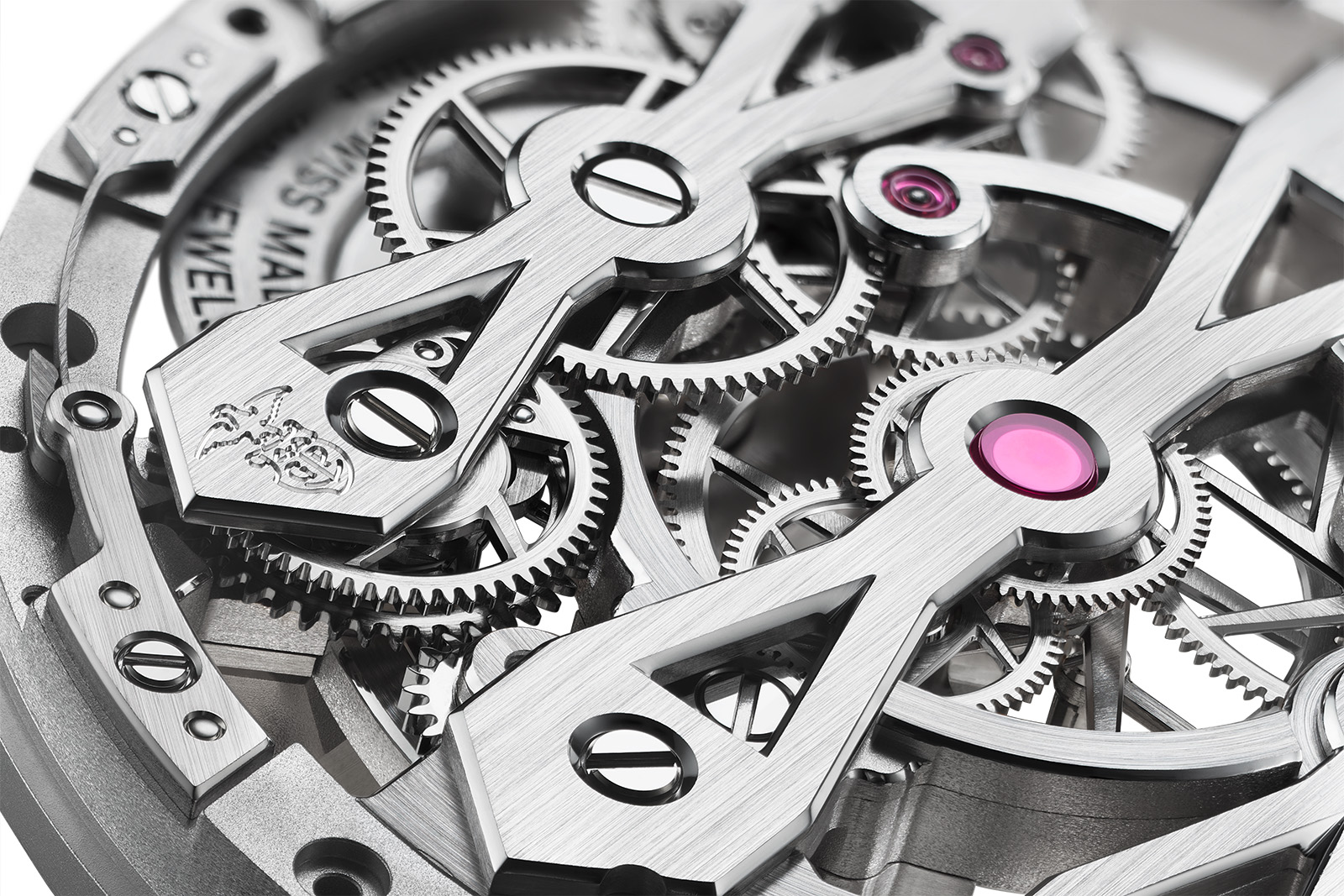 Stylistically, the movement is intentionally monochromatic, with bridges, gears and screws sharing the same silvery colour. The only colourful break is provided by the purple jewels set in each of the not-so-gold bridges.