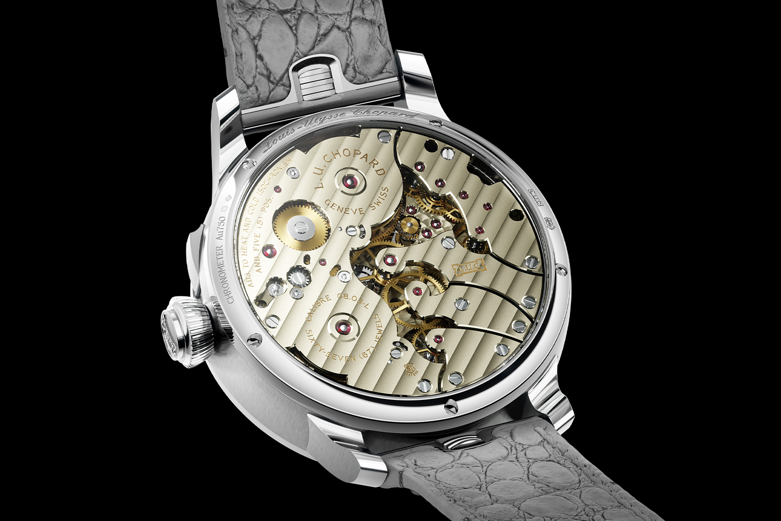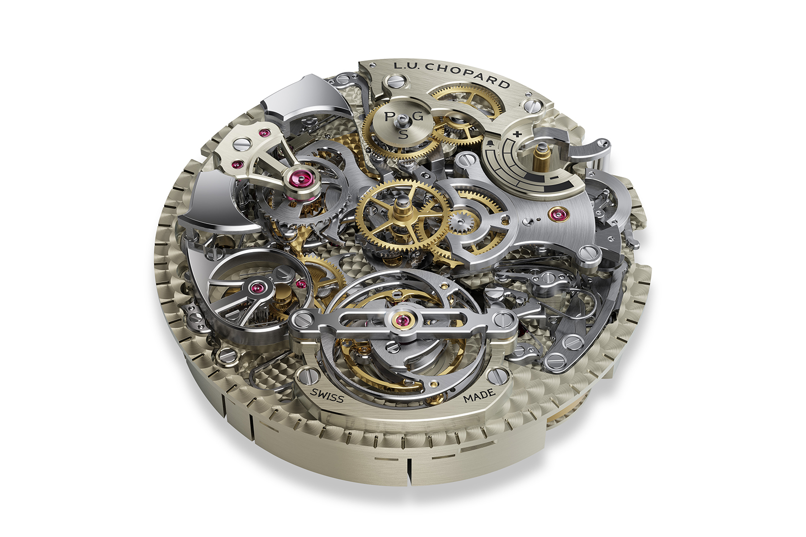 To test the strike works’ resolve, Chopard tested the 31,200 activations in grande sonnerie mode, another 31,200 in petite sonnerie mode, and 3,000 of the trip minute repeater on a single prototype to simulate five years of operation.