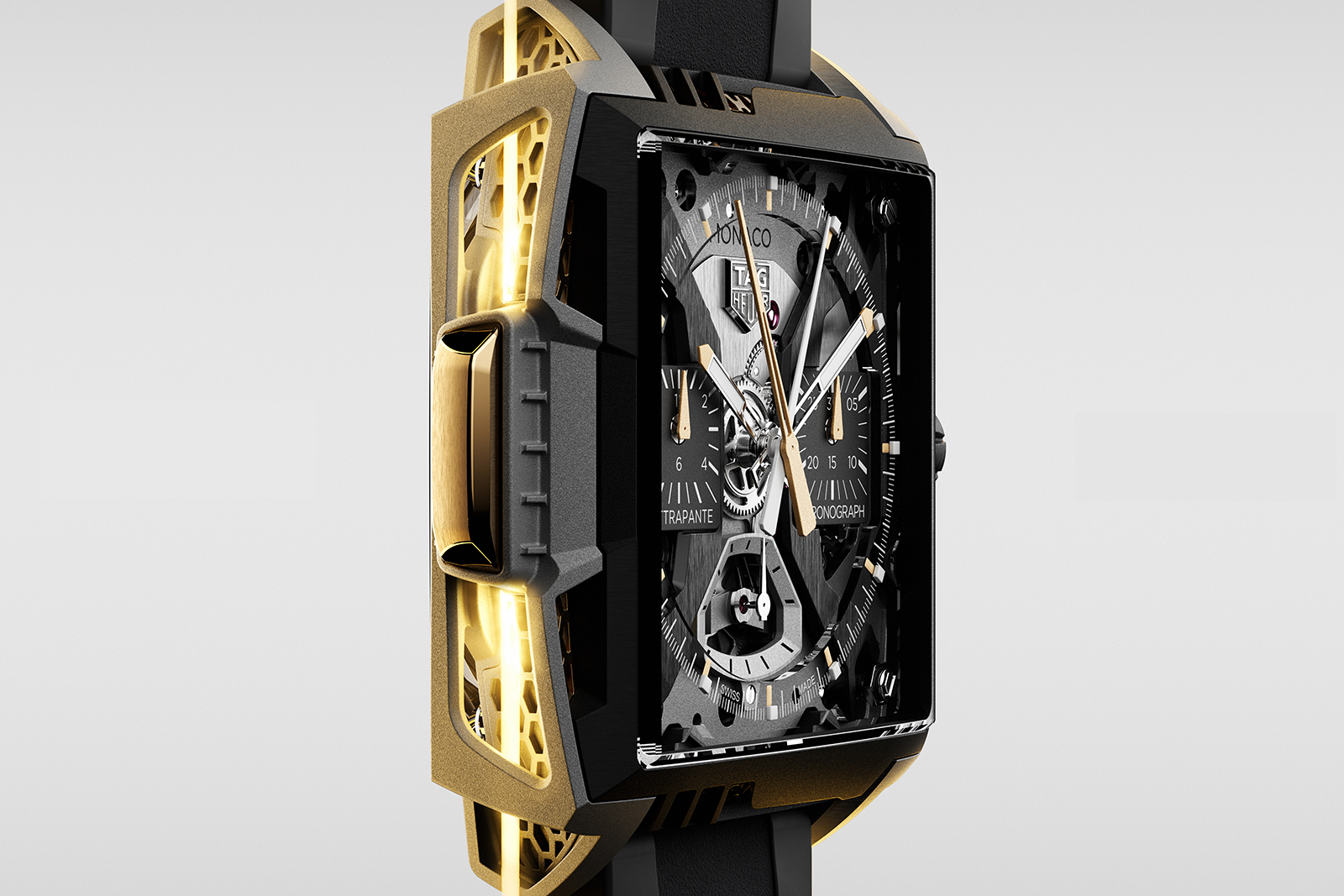 Retrofitting the Lemania tourbillon ebauche entailed some compromises. For one thing, it was thicker than it should have been, a factor that led to the downward-sloping seconds hands mounted to the tourbillon carriage.
