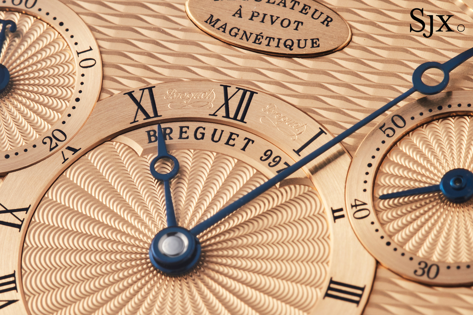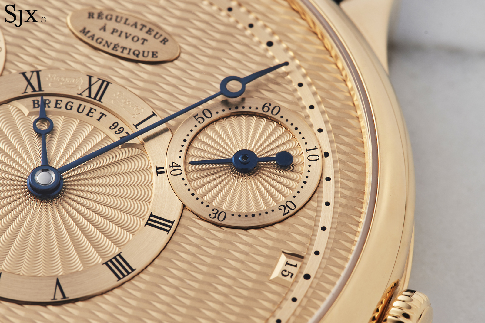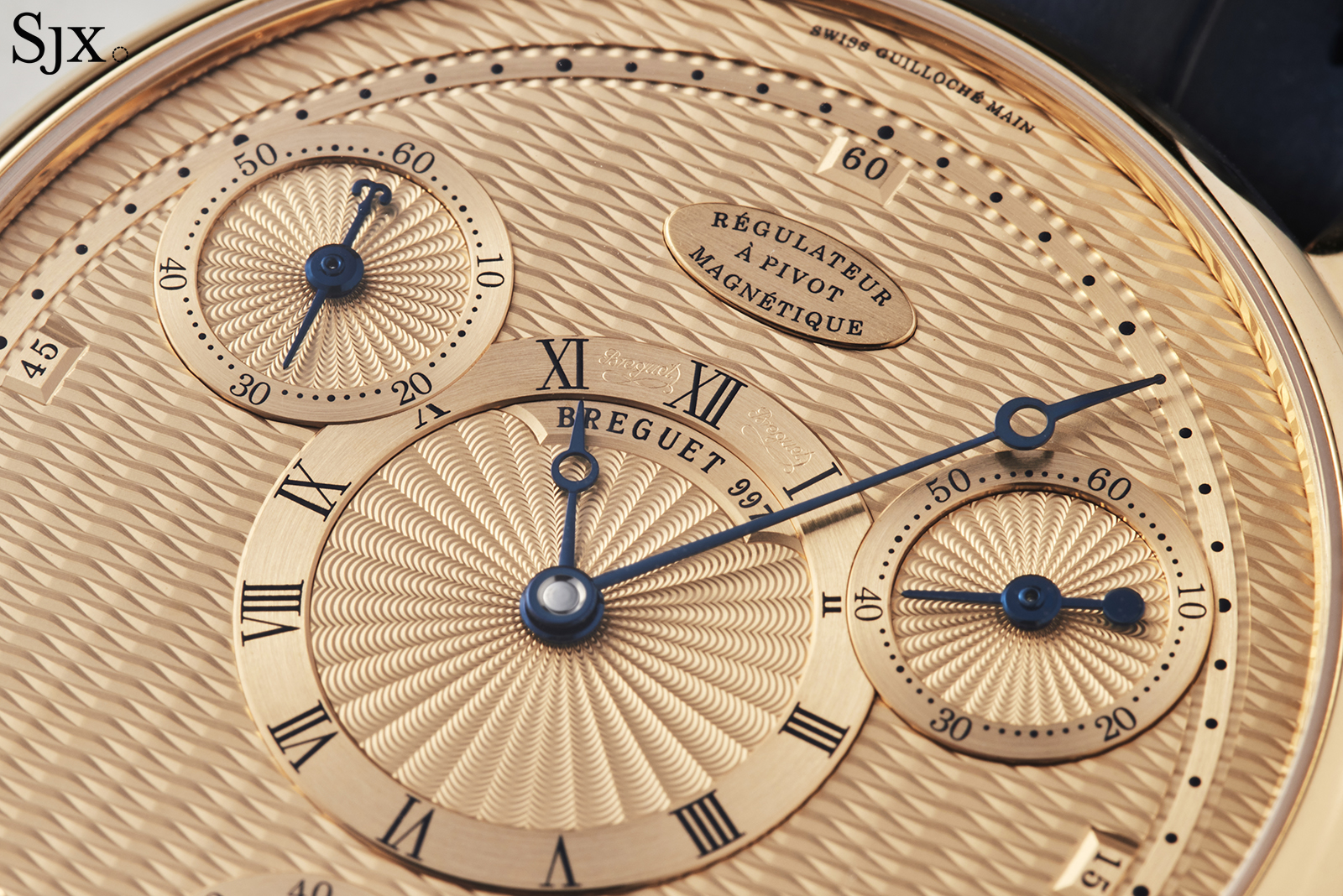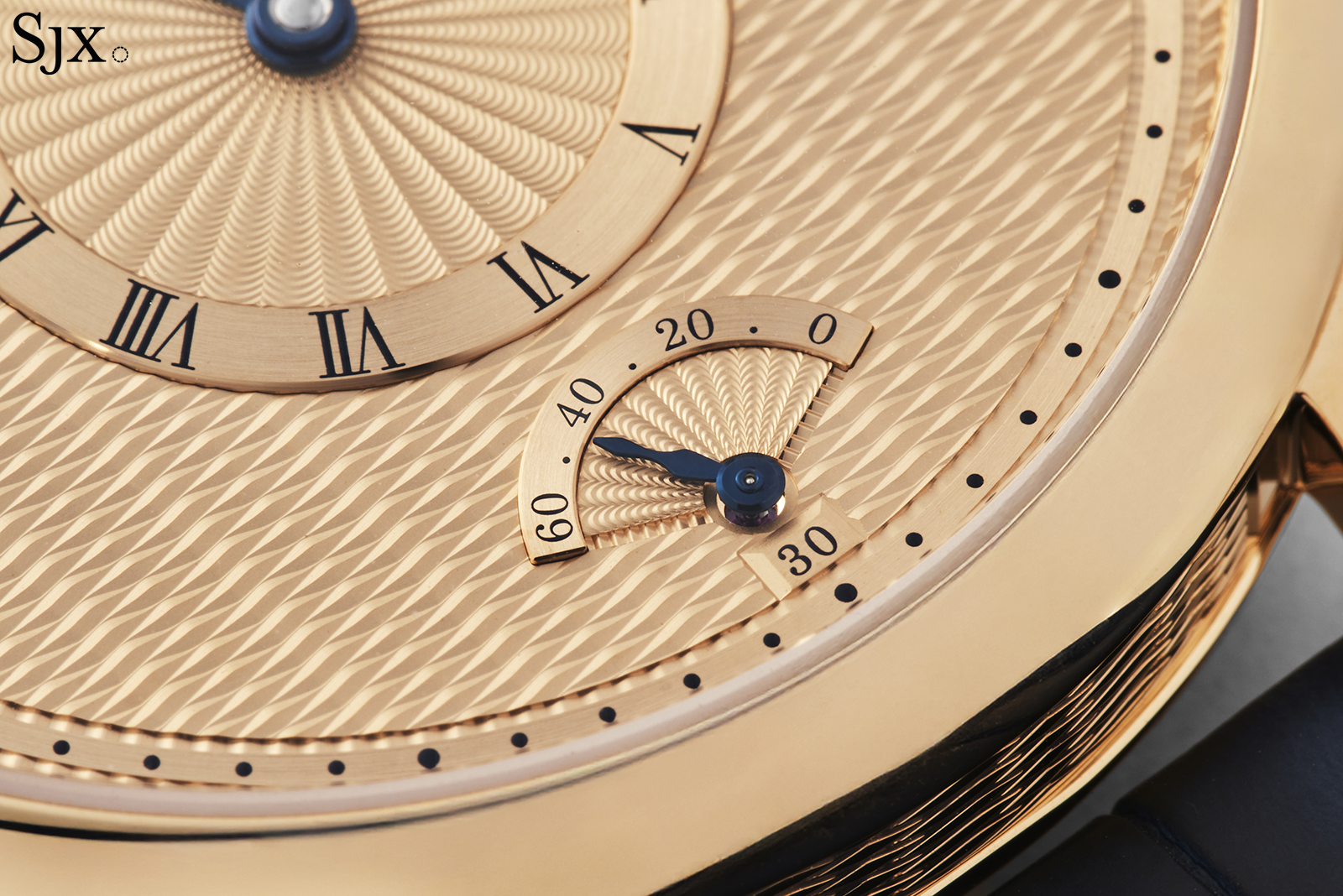 Made of several parts, the dial is impressively executed. The guilloche is sharp and refined, and according to Breguet, done on hand-operated rose and straight-line engines, as is tradition. All of the dial parts are solid 18k Breguet gold, a yellow gold alloy that’s proprietary to Breguet.