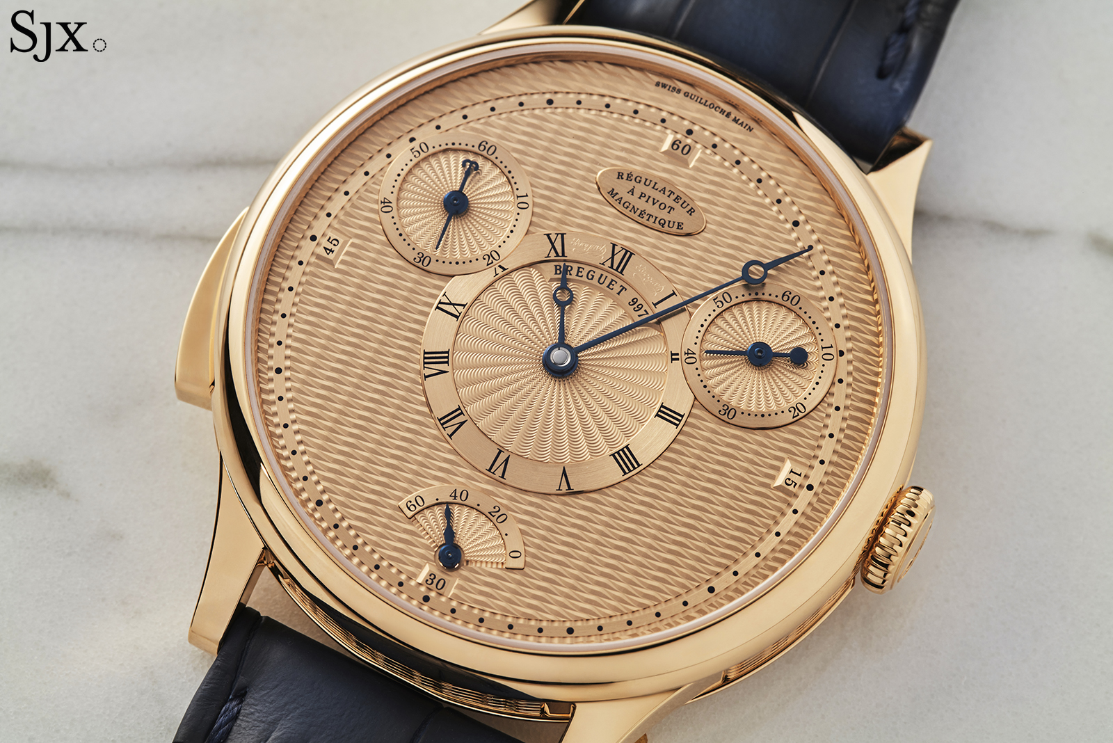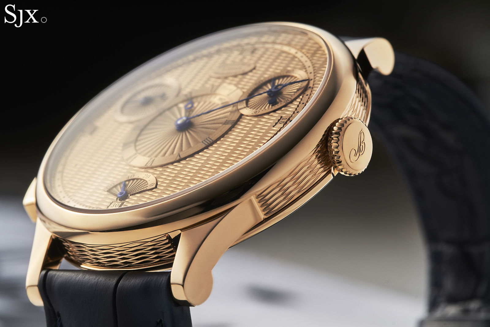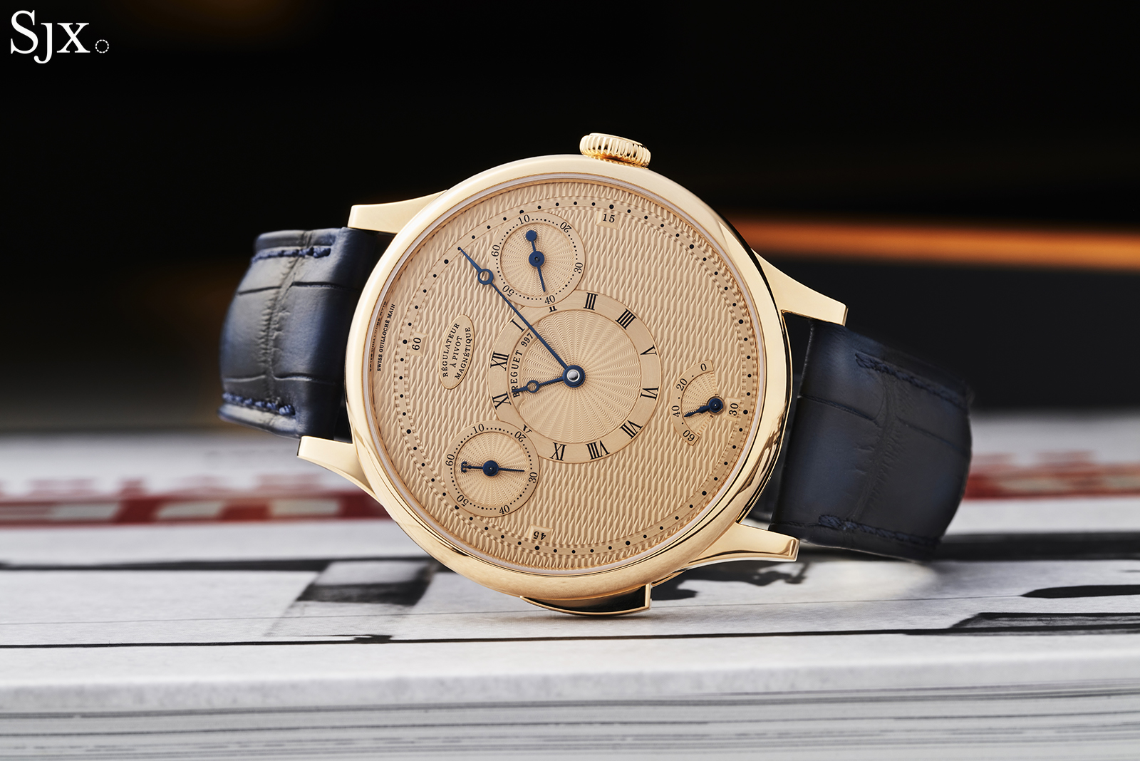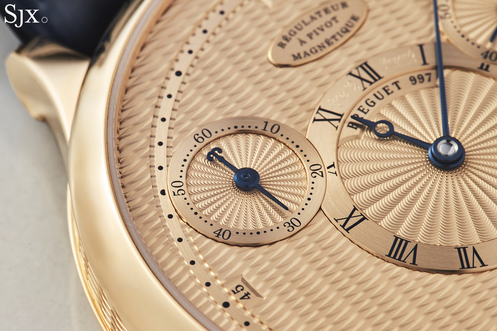 Made of several parts, the dial is impressively executed. The guilloche is sharp and refined, and according to Breguet, done on hand-operated rose and straight-line engines, as is tradition. All of the dial parts are solid 18k Breguet gold, a yellow gold alloy that’s proprietary to Breguet.