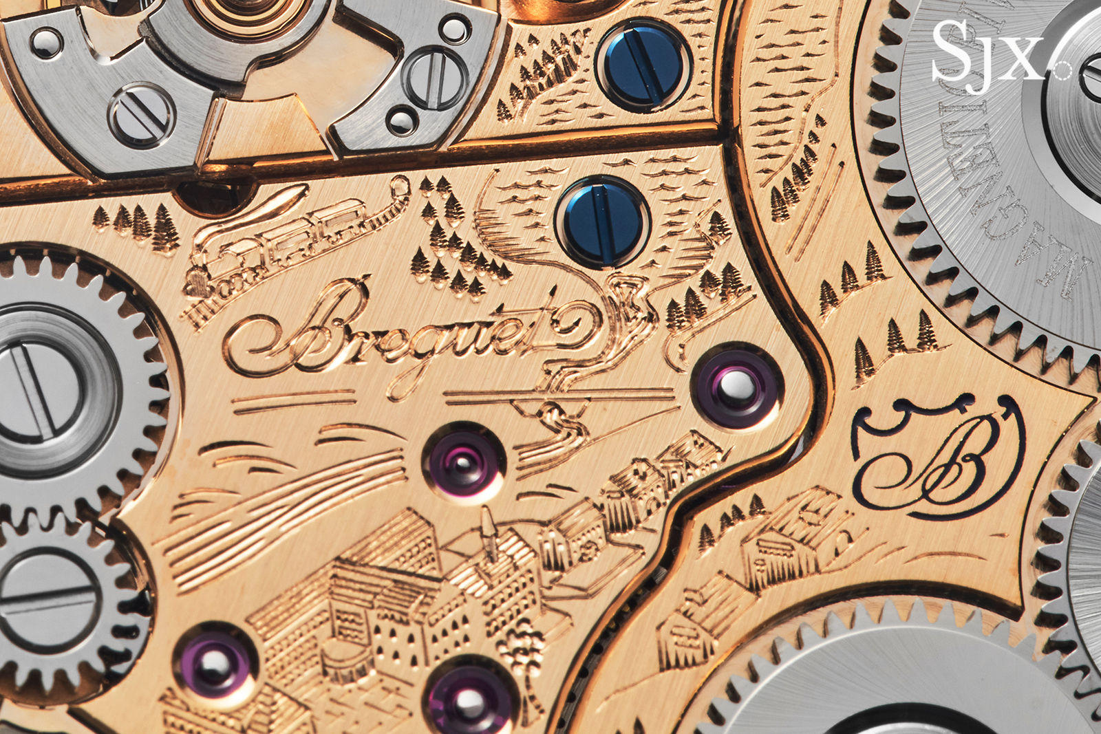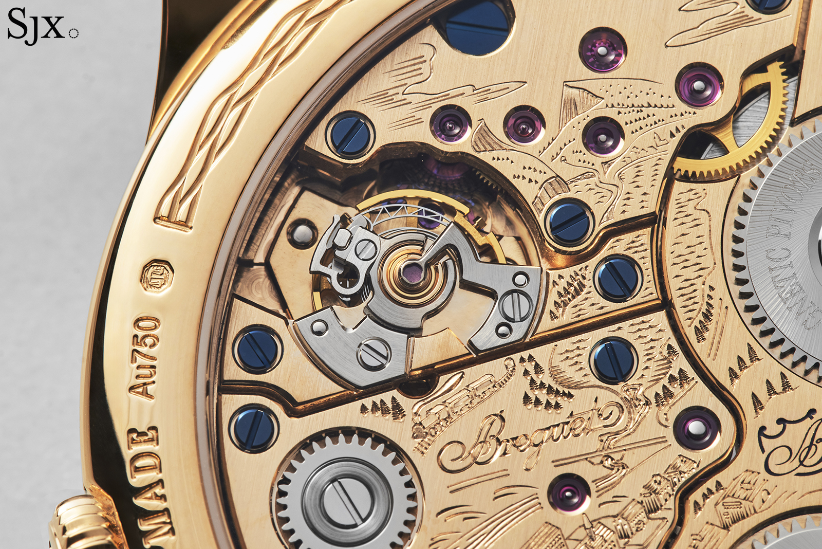 The overall architecture of the movement remains unchanged, though it has been dressed up substantially compared to the cal. 574 DR. The bridges have been plated in Breguet gold and then hand engraved with a view of Le Chenit, the town where Breguet is now headquartered. As with the engraved movement on the new Type XX, this feels a little overdone in terms of visuals but I can’t fault the quality of the work.