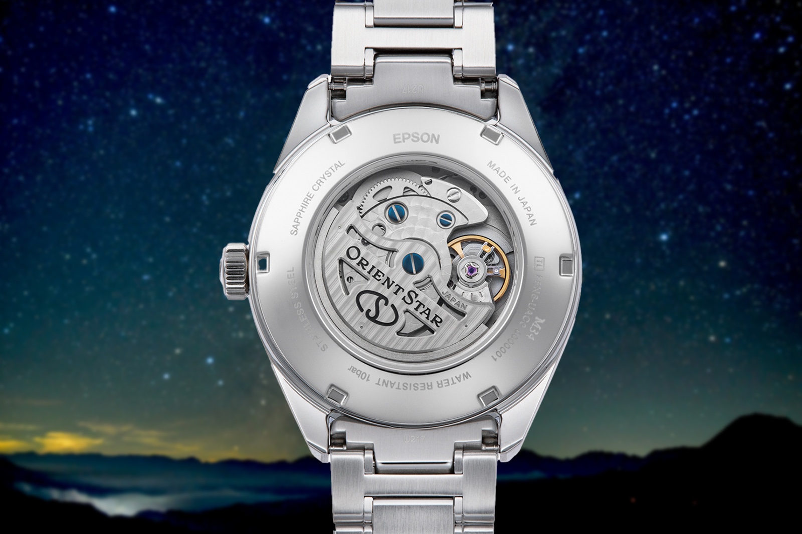 The dial of the M34 is where Orient Star’s connection to Epson truly pays dividends. Two elements stand out in particular: its engraved base and its optical coating. Fittingly, the pattern is inspired by the Perseid meteor shower, echoing the brand’s celestial theme.