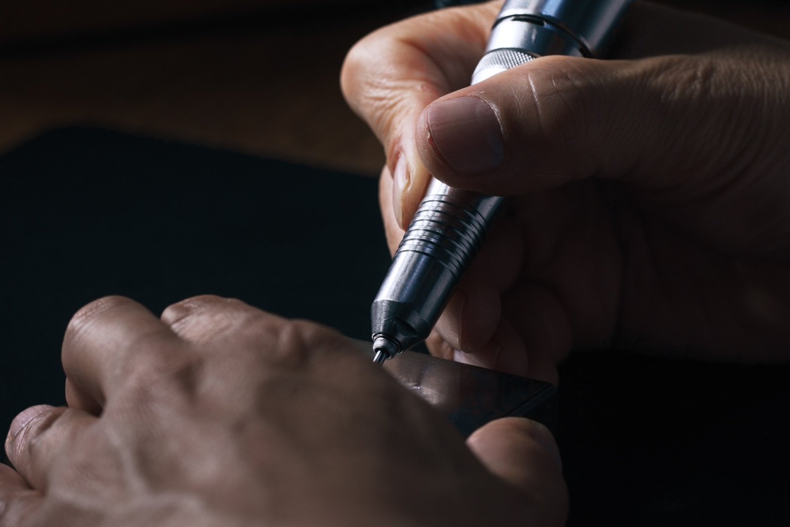 The dial begins as a brass disc stamped using a hand-engraved die. A craftsman employs a rotating engraving tool to cut the pattern directly into the steel mould, which is then used to imprint the intricate texture onto each dial blank. The use of a hand-engraved die results in a pattern with sharper relief and more natural variation than a typical machine-cut texture.