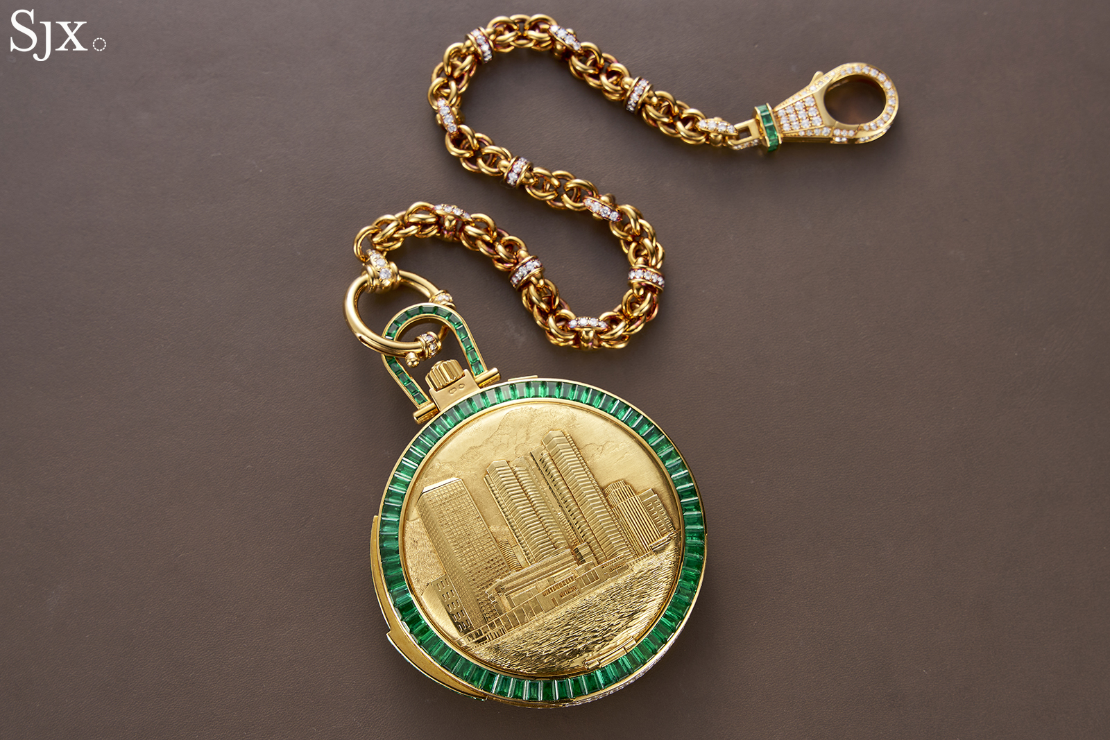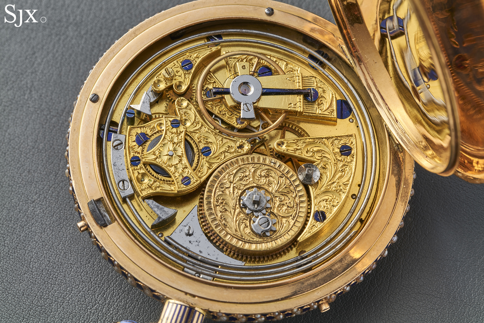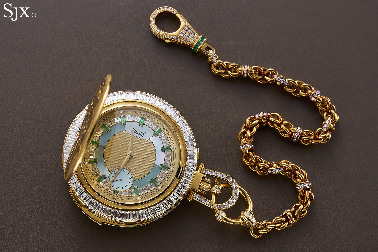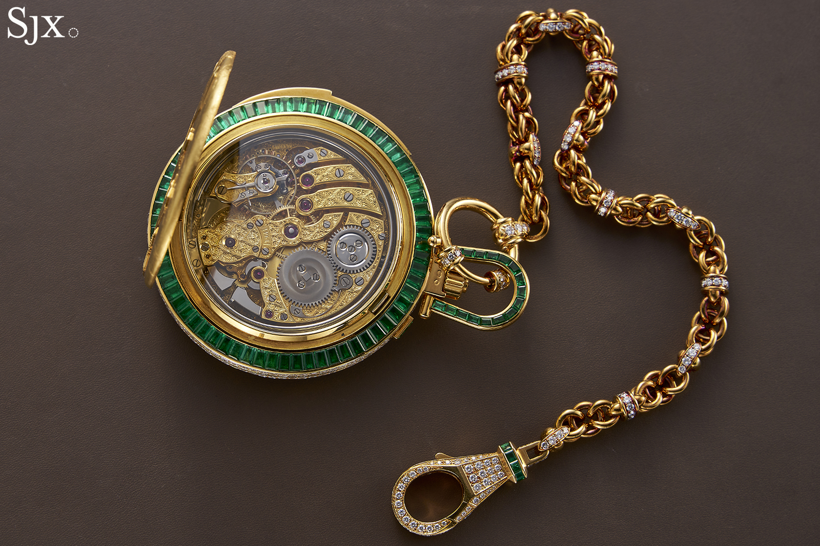 Rather than enamel, the most extravagant pocket watch in the auction focuses on gem setting. The front cover, front of the bow, and case band of the 58.5 mm hunter-style case are set with 246 baguette-cut diamonds (22.6 carats total) while 89 baguette emeralds (8.83 carats) adorn the reverse cover, the other side of the bow, as well as the time-setting button and repeater slide.