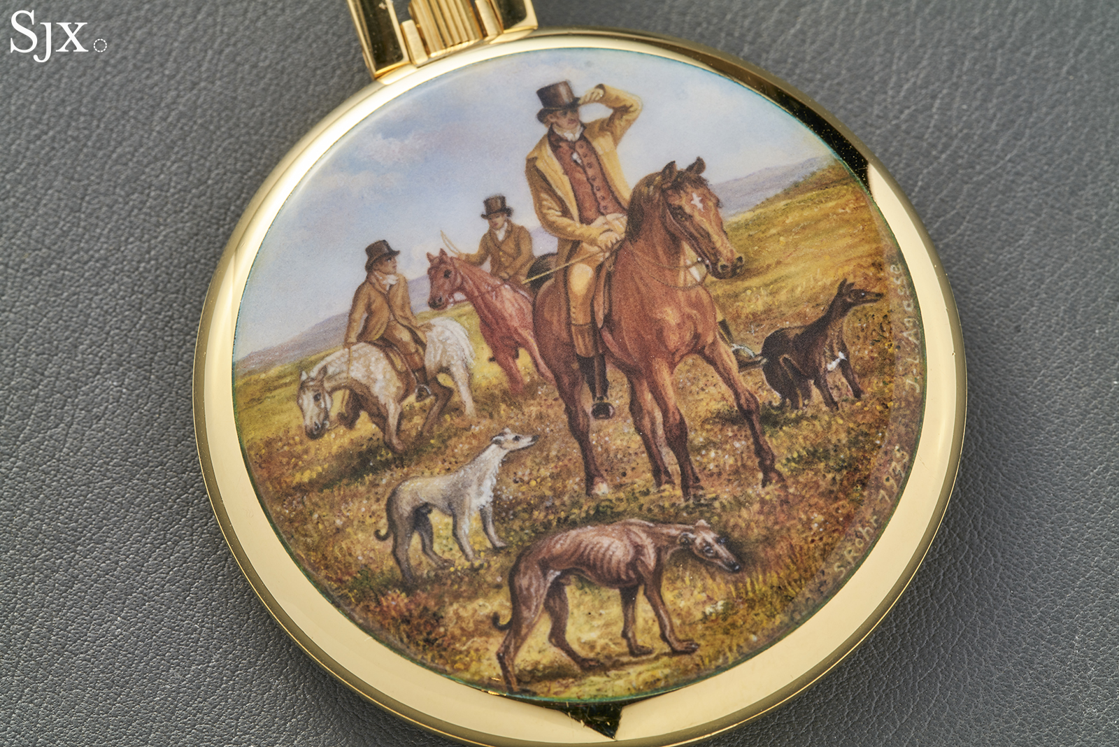 This example, rendered in 1975, replicates a work by Genevan landscape painter Jacques-Laurent Agasse from a century and a half earlier, depicting his patron, Lord Rivers of London. The original, part of the Pictet Collection in Geneva is just over a metre wide, which Rohr reproduced on the back of a 47 mm pocket watch.