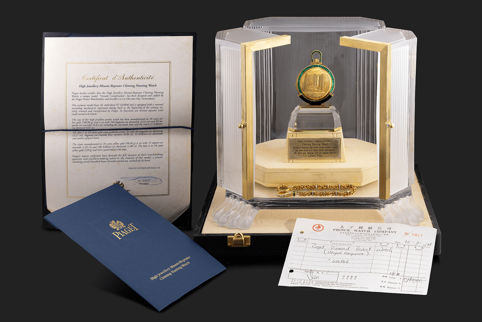 Piaget debuted this watch, with its monumental display stand, in 1996, in anticipation of the Hong Kong handover the following year. Many watch brands released limited editions to commemorate the handover, which were popular with wealthy Hongkongers as evidenced by several examples in this auction.