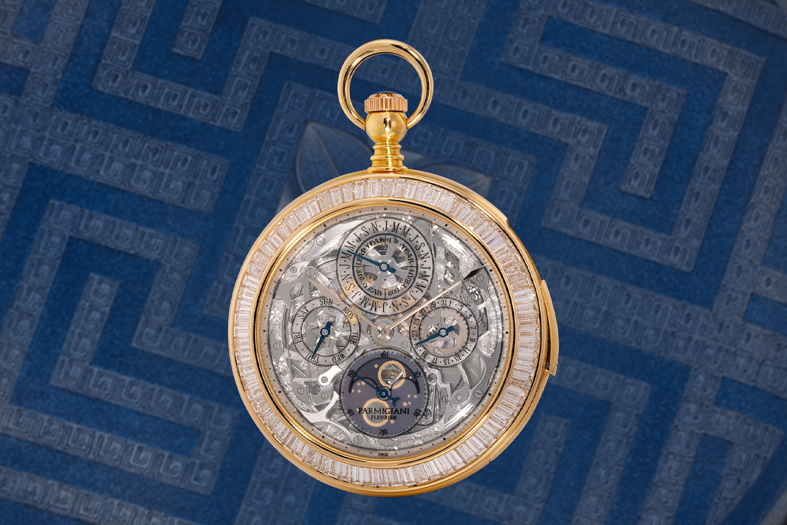 The movement, based on a LeCoultre ebauche from the turn of the century, is equipped with a perpetual calendar, fully visible though the sapphire dial. The back is enamelled with an abstract pattern, a common motif for Parmigiani watches. It would make for an ideal display piece, as it is paired with an enamelled stand made of gilt silver.
