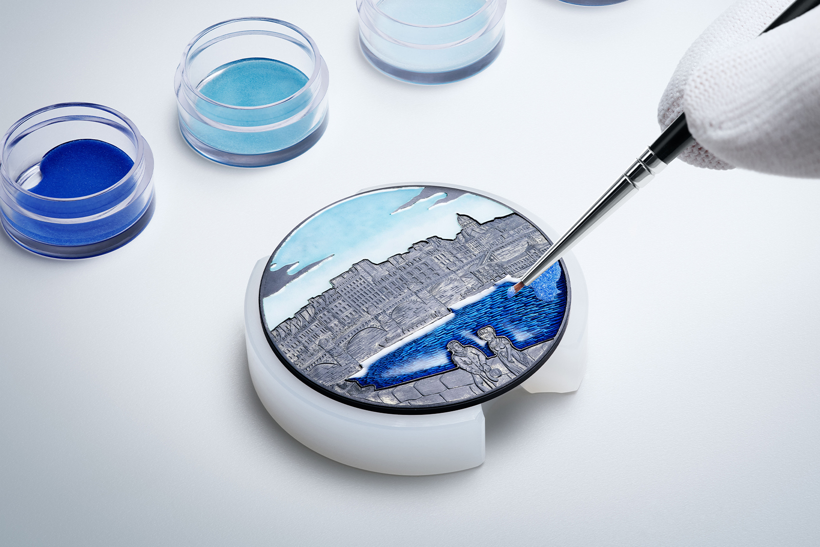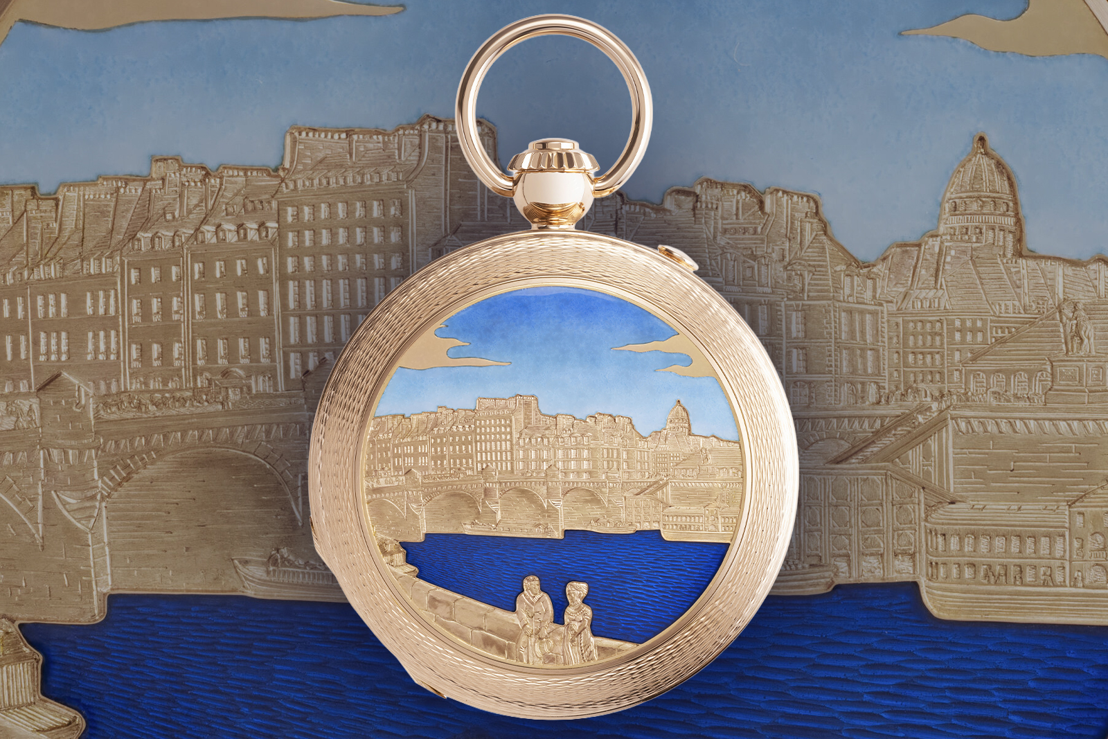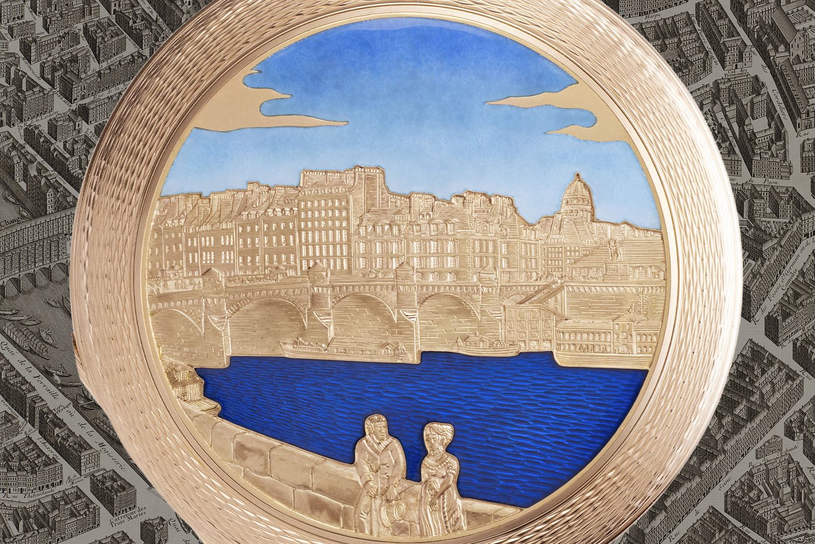 On the front is an intricate, hand engraved depiction of the River Seine, and Quai de l’Horloge, the street on which Breguet’s workshop was located. The building occupied by Breguet, now addressed as 26 Place Dauphine, is at the centre of the scene. The Seine river is also Bleu de France enamel to make it pop.