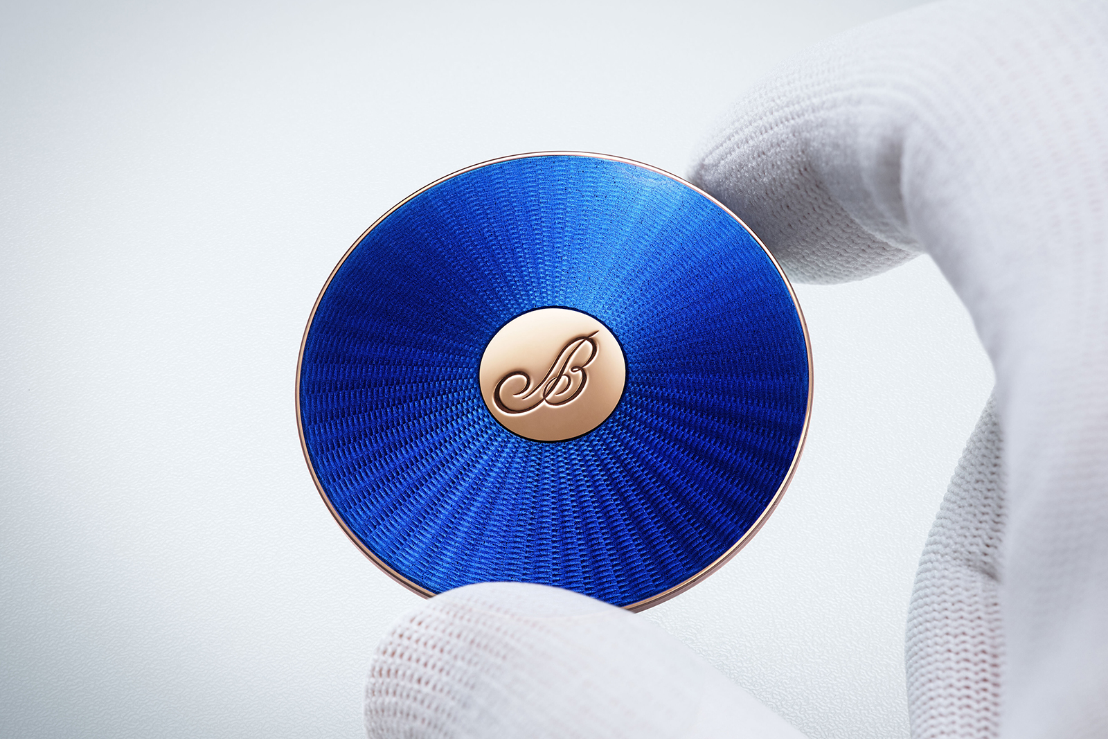 The case band, and rear cover are all Breguet Gold and adorned with a Quai de l’Horloge guilloche pattern, inspired by the famous isometric Turgot map of Paris. The guilloche on the back cover covered with Bleu de France grande feu enamel and the Breguet “B”.