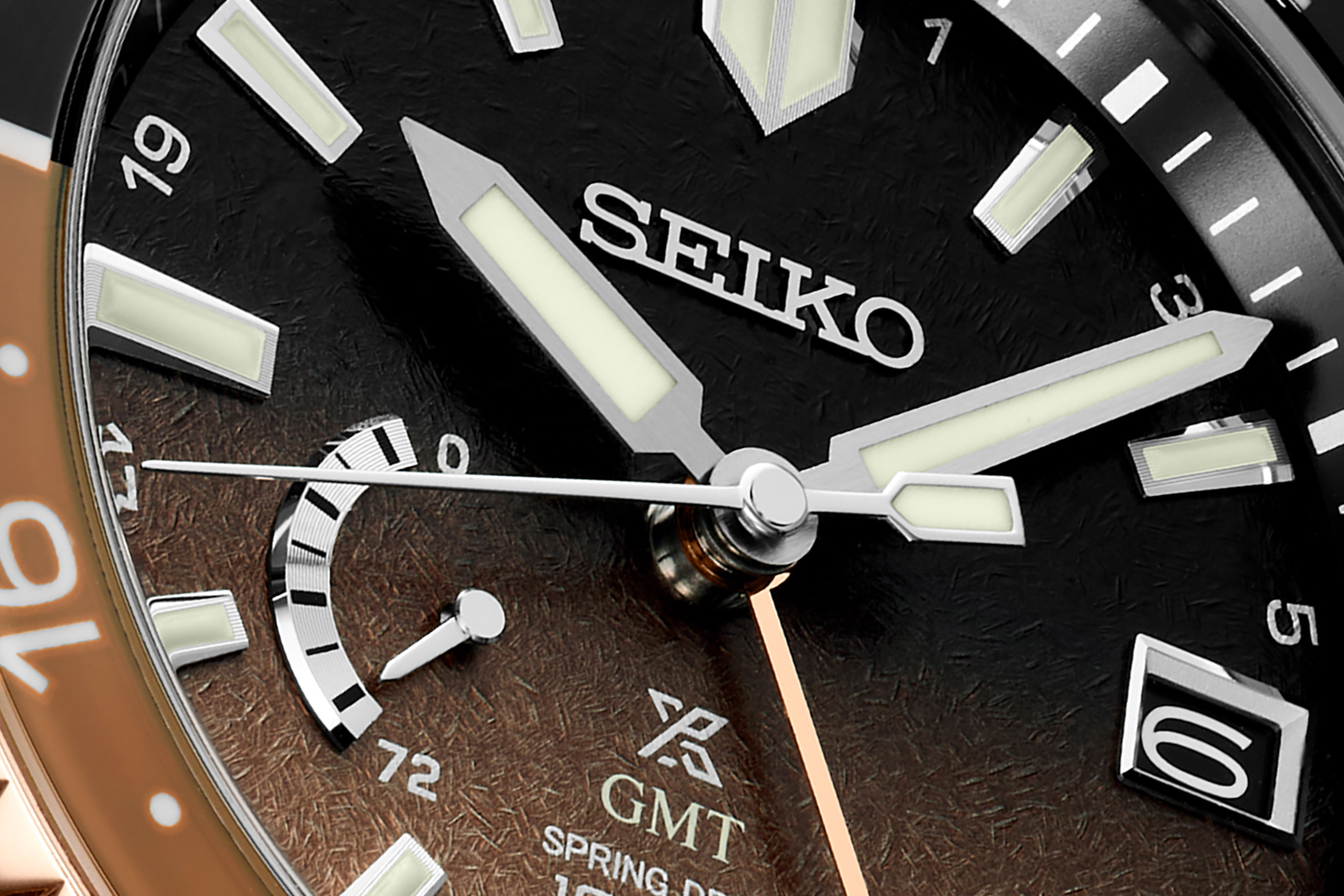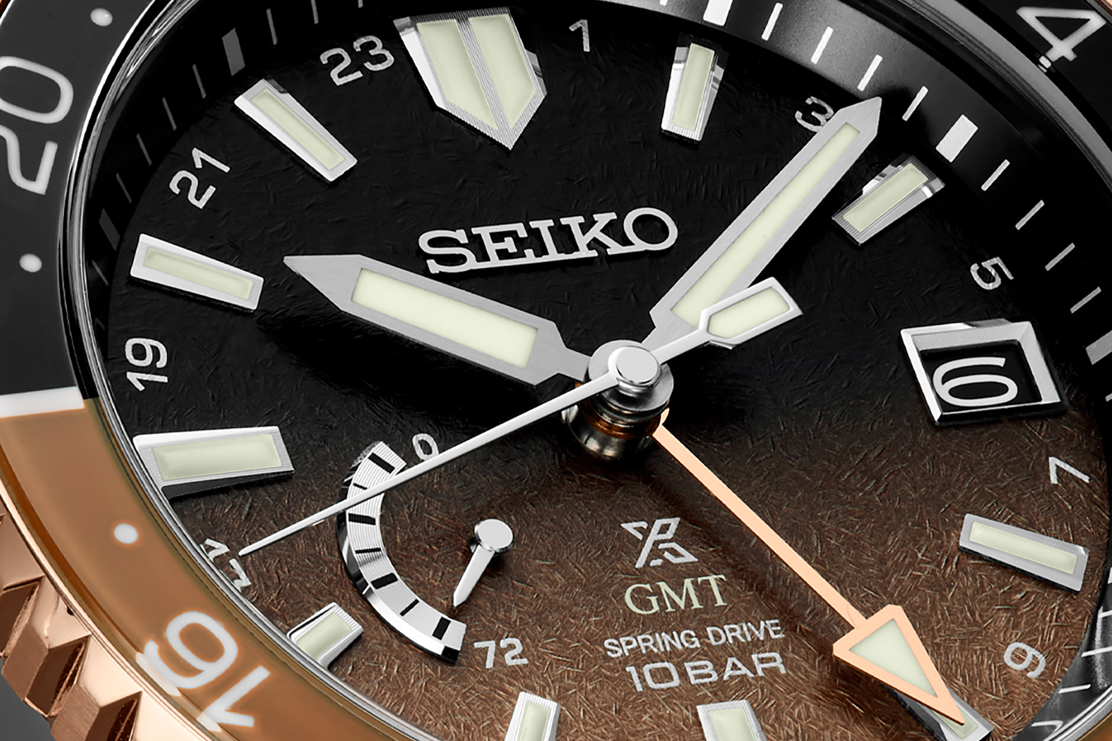 Building on that the design codes established by earlier Prospex LX GMT models, the SNR058 distinguishes itself with its warmer palette. The crown and bezel are rose gold-plated to complement the nebula-inspired gradient dial, a treatment echoed by the sapphire bezel insert. While this marks the third LX GMT to feature a gradient dial — and the third with this specific dial texture — it is the first to combine the two.
