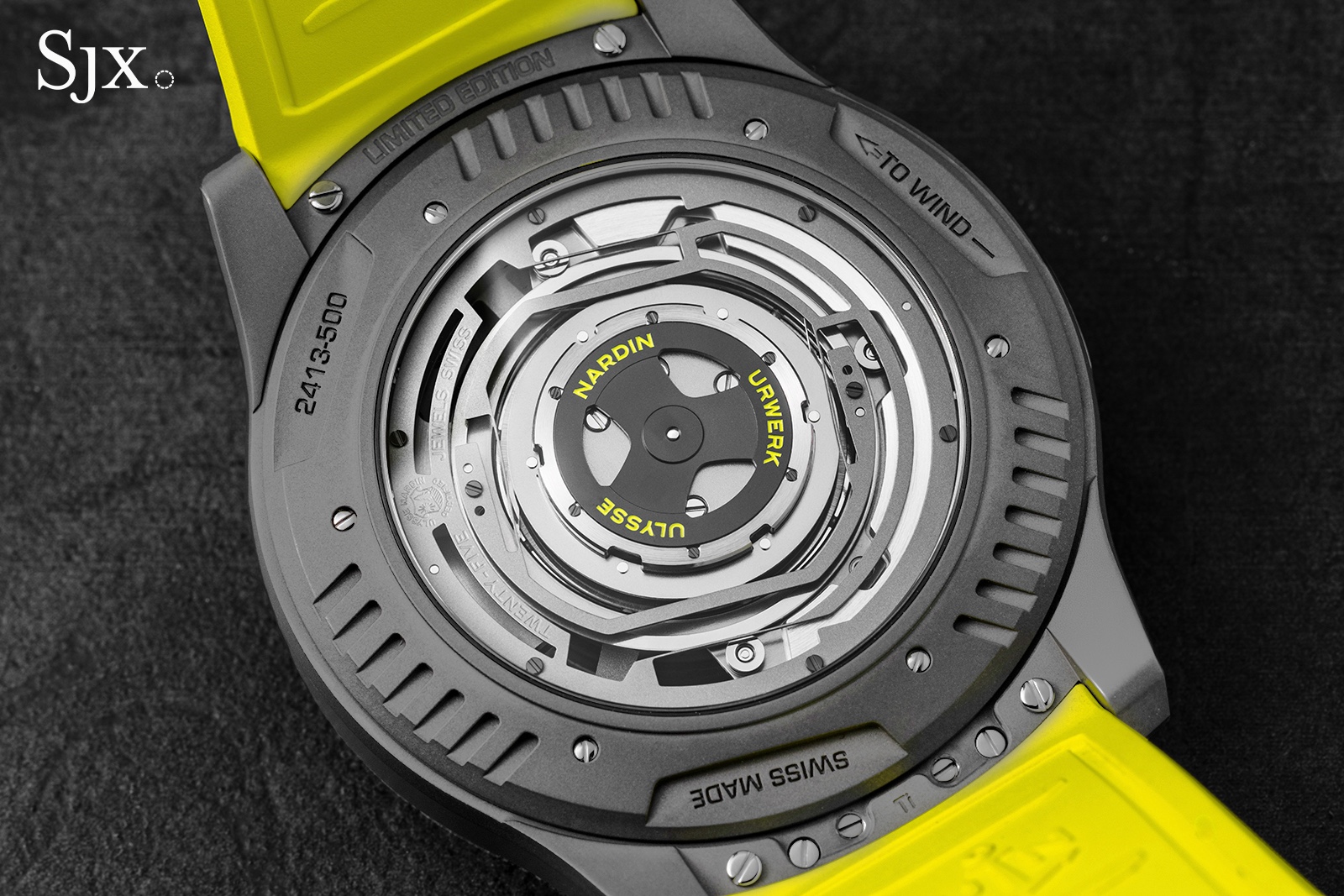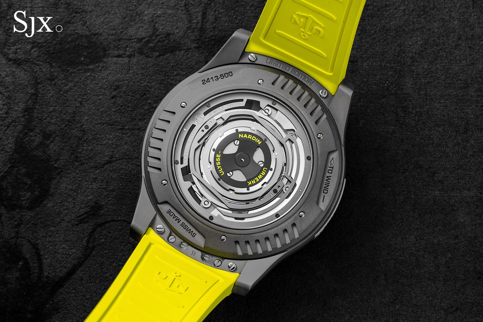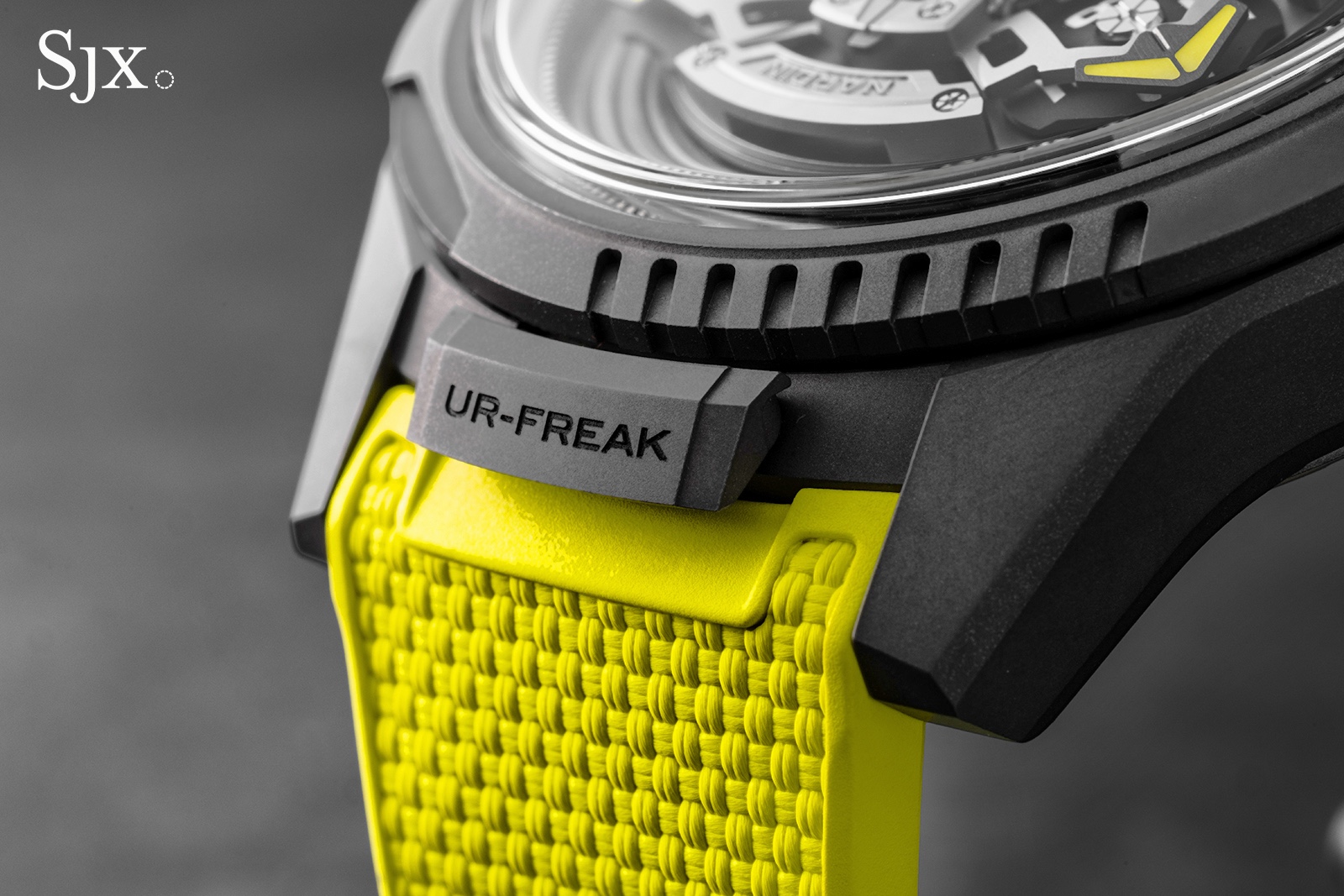 Around back, the UR-Freak is all Ulysse Nardin; the Urwerk influence is limited to the textures and colours. A sapphire crystal case back affords a view of UN’s proprietary Grinder automatic winding system, which gives the UN-241 movement a look quite unlike anything else.