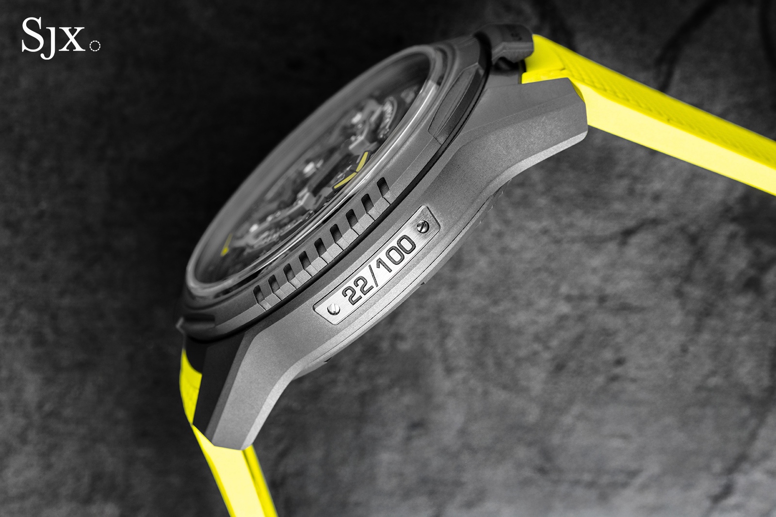 This arrangement solves one of the less appealing aspects of the standard Freak, which is the legibility of the hours display. The Urwerk-style wandering hours carriage moves the hour digits right next to the minutes scale, simplifying the process of reading the time.