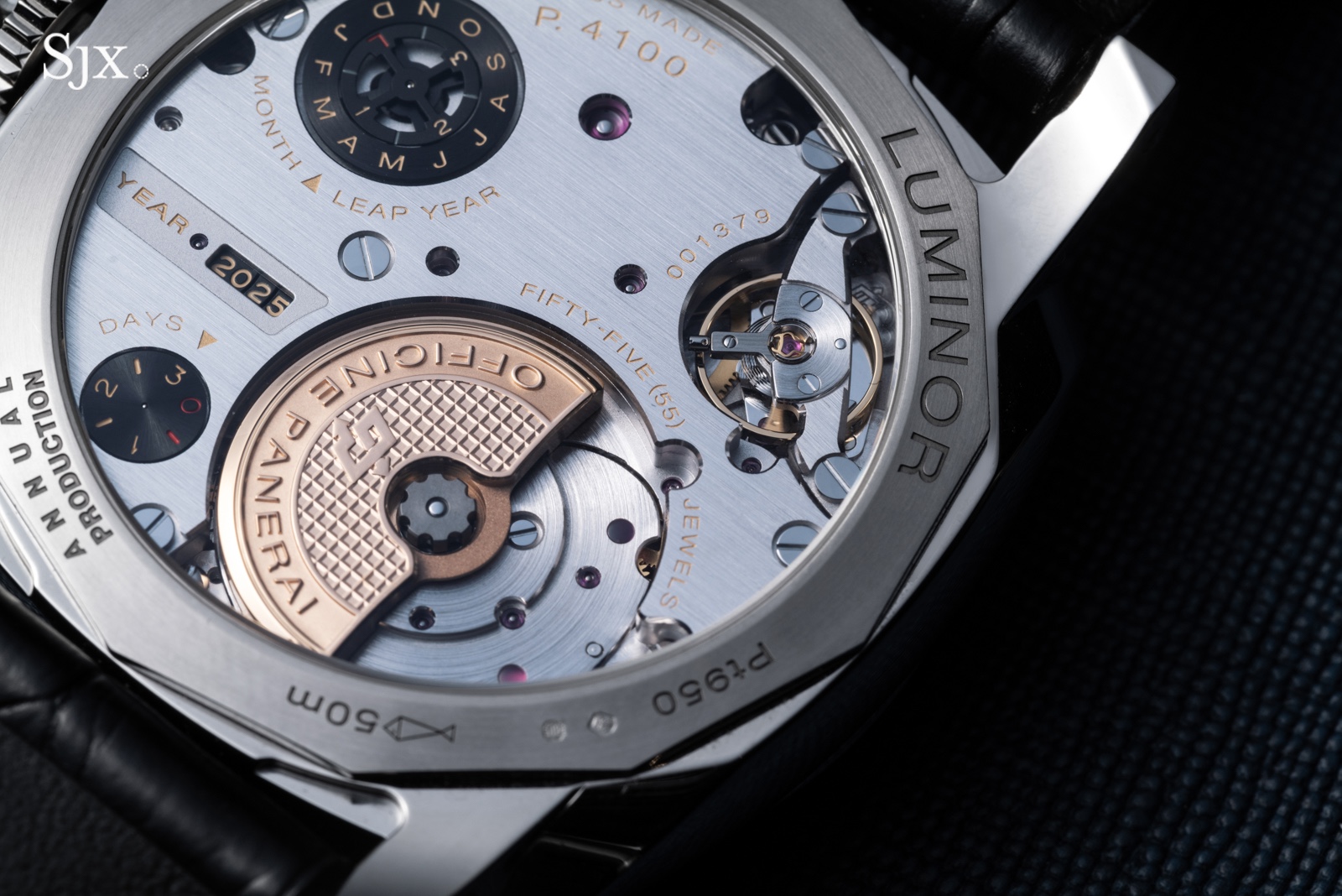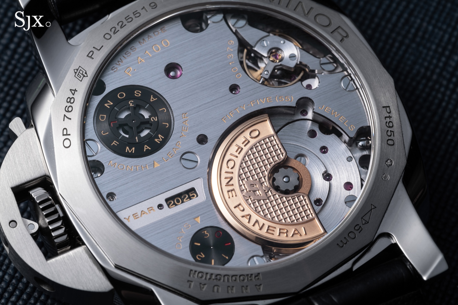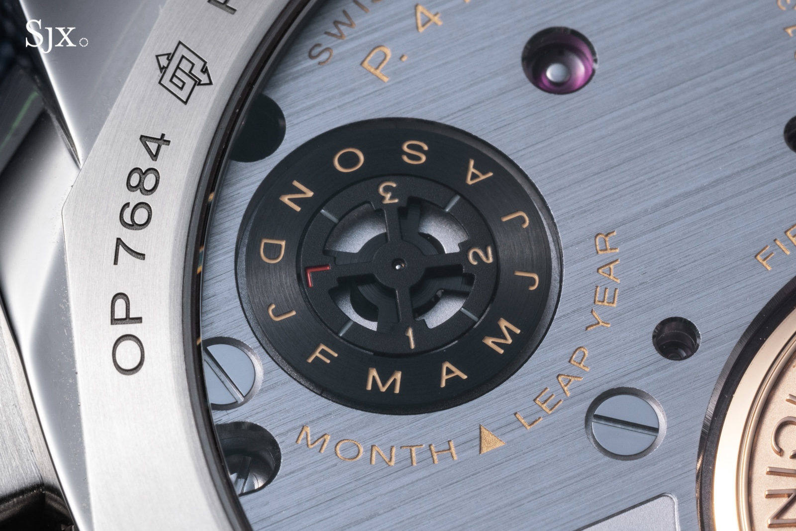 By concealing its complicated core, the PAM01575 takes after minimalist perpetual calendars like those of H. Moser & Cie. The month and leap-year discs, which usually take up valuable dial real estate, have been relocated to the back of the movement, alongside a four-digit year display and power-reserve indicator.