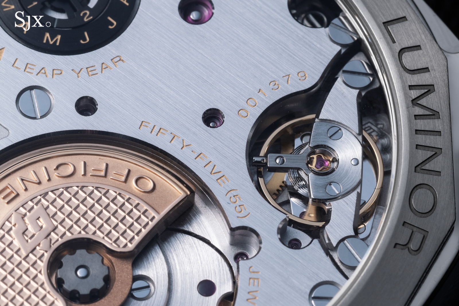 Platinumtech is a surface-hardening treatment that increases the Vickers rating by about 40% compared with untreated platinum. Surface treatments like this can make it difficult to polish and refinish the case, but the hard coating feels like the right trade-off for a rugged watch like the PAM01575. It’s also coherent with the overall theme, which is to make a perpetual calendar that fits the Panerai ethos.