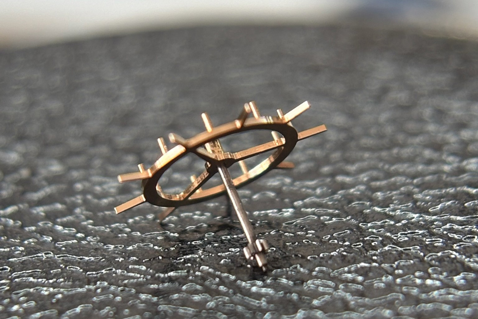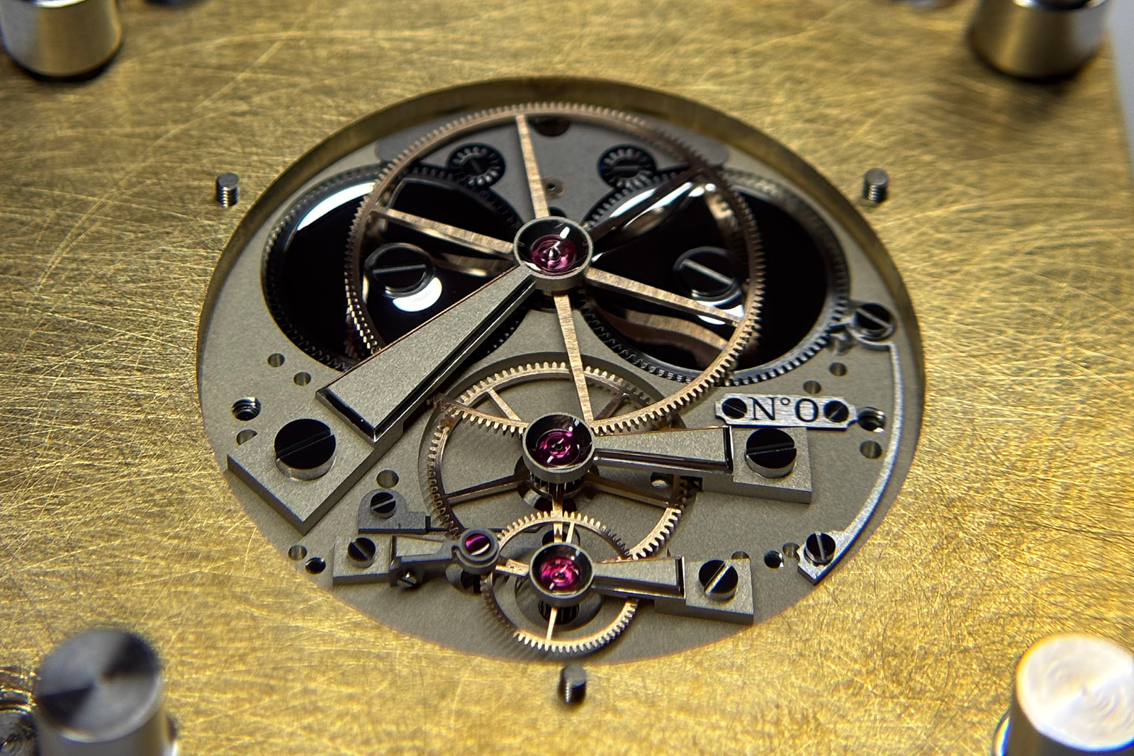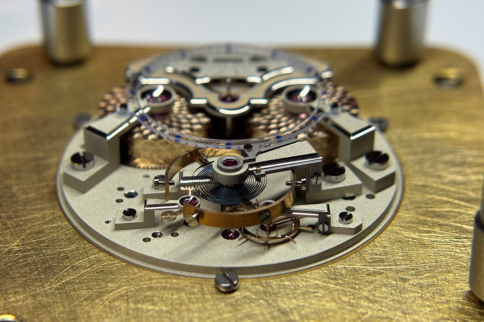 As mentioned, this piece strikes a balance between haute horlogerie and rustic finishes. One element that draws the eye and that falls into the latter category is the parechute shock absorbers securing both the balance and escape wheel pivot jewels. Lacking any polish or bevels, the springs are coarsely grained, giving a above all a sense of utility.