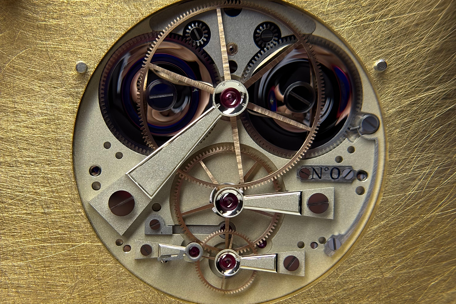Furthermore, the two large parallel barrels likely supply a hearty amount of torque to the escapement and oscillator, increasing the risk of over-banking the balance. To compensate for this risk, the watchmakers put an additional counterweight geared to the balance, assuring the added “dead weight” keeps the balance oscillating at suitable amplitudes only.