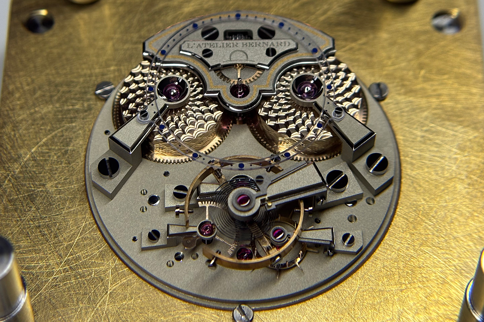 L’Atelier Bernard came up with their own version of the duplex escapement, which falls under the more rustic elements of the Owl. For example, the escape wheel is built with tall pins instead of the conventional second level of impulse teeth. Also, the impulse pallet on the balance is not ruby, but rather made of the same material as the escape wheel. Due to the soft nature of the radial impulse the watchmakers perhaps believed a jewel was not required.