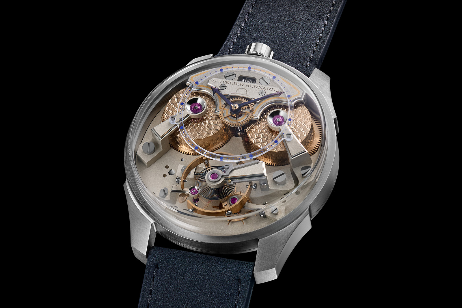 The Owl is handcrafted by a pair of young and talented watchmakers, Bernard Van Ormelingen and Bernard Braboretz, the masterminds behind L’Atelier Bernard. Those who closely follow independent watchmaking might remember Mr Van Ormelingen’s name from the Van Bricht series, for which he produced the guilloche dials. Clearly a show of their shared aesthetic sensibilities and technical chops, the Owl is meant to kickstart the independent creators’ artisanal venture in Fleurier.