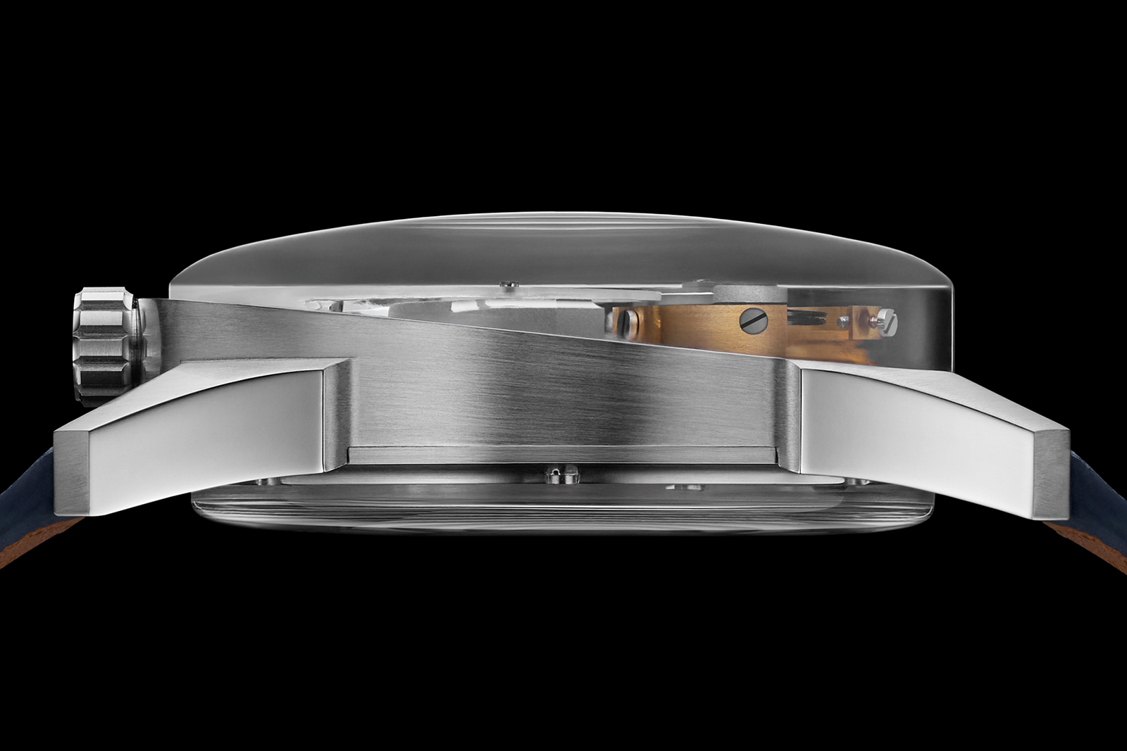 The stainless steel case has strong, angular lugs — a modern abstracted take on the Cornes de Vache. Normally this style isn’t to my taste, but it fits this watch well. Interestingly, the case slopes downward from top to bottom, a trick that reveals the side view of the unusual oscillator thanks to a cylindrical, domed sapphire crystal.