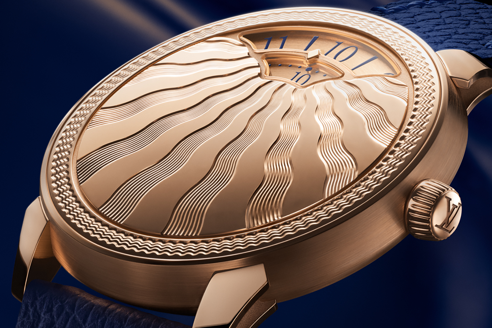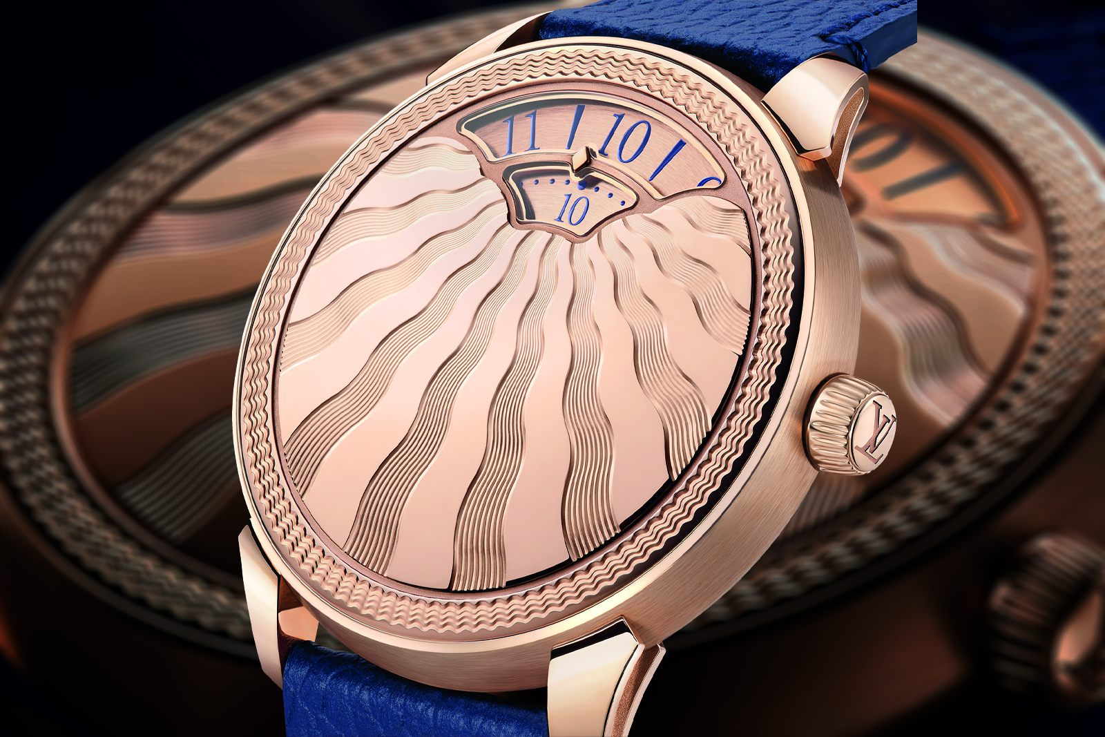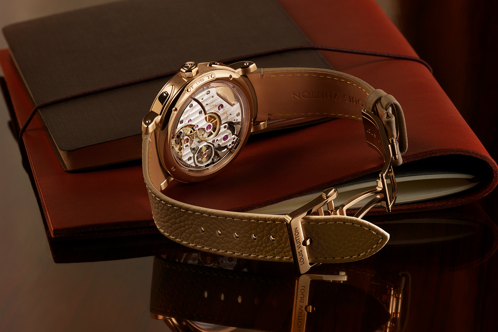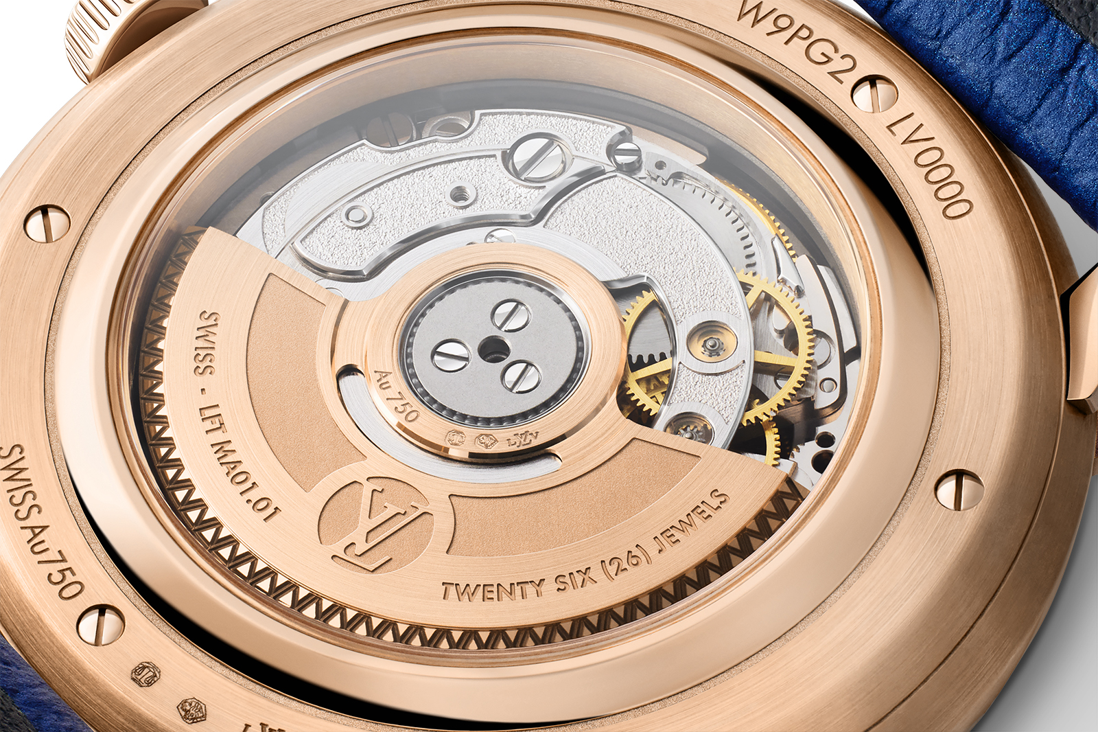 The case back features a saffron sapphire – Louis Vuitton’s corporate colour – to indicate the case is platinum. This subtle Easter Egg is likely inspired by Patek Philippe’s practice of placing a diamond between the lugs of its own platinum watches.