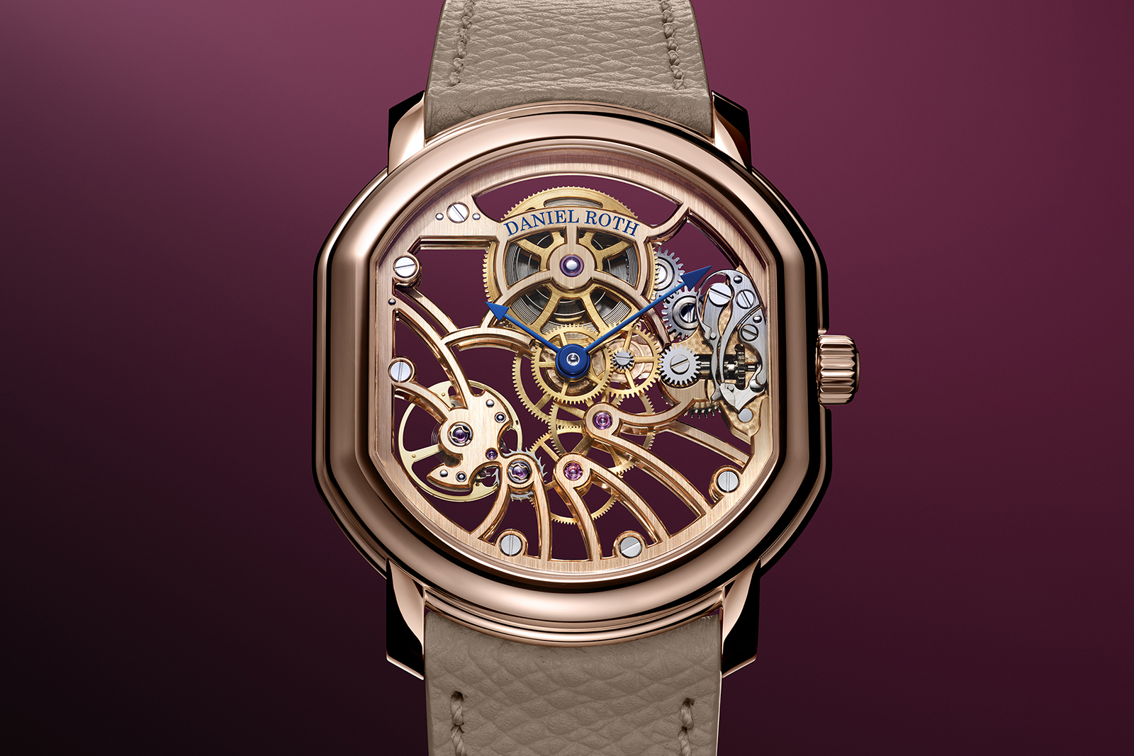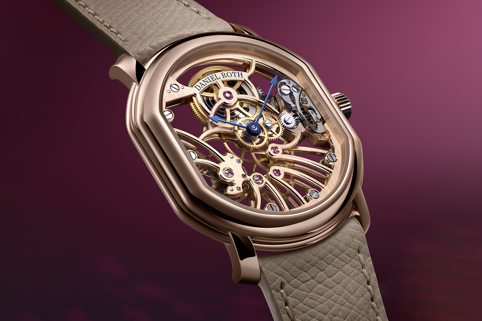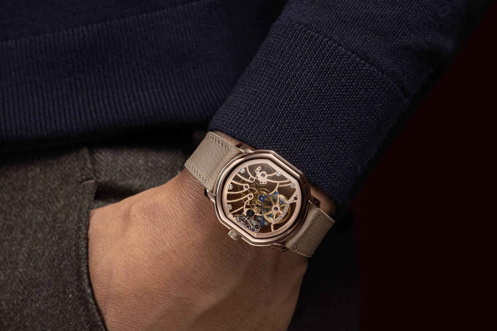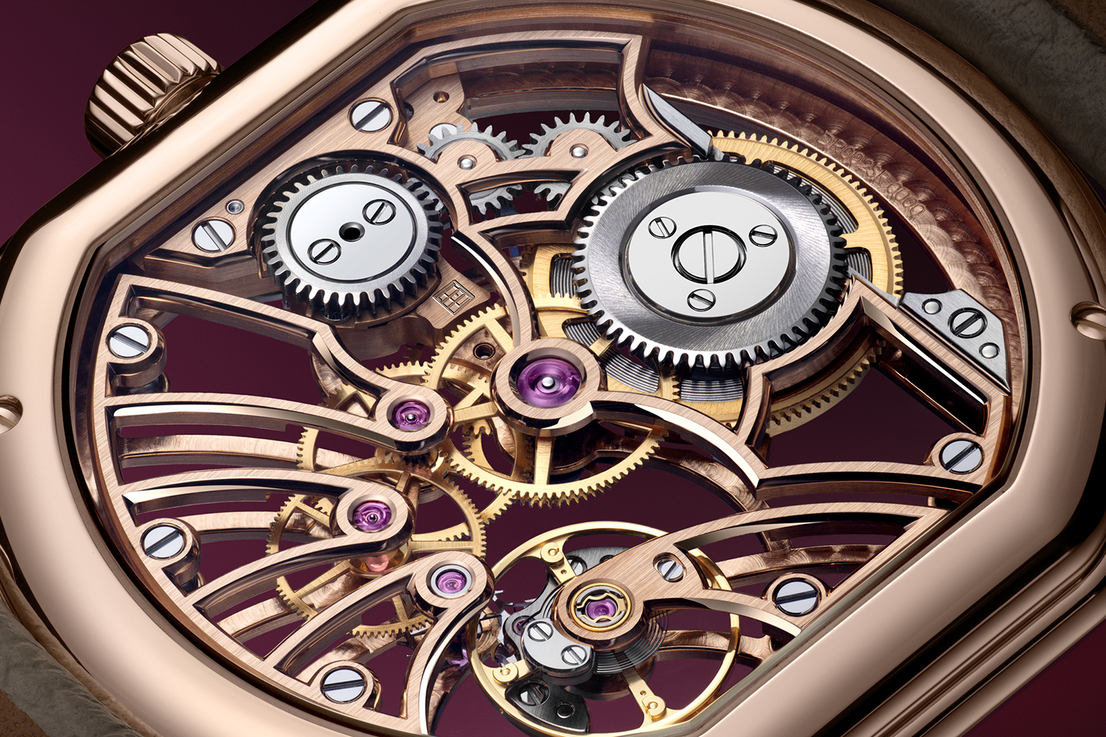 The finishing reinforces the brand’s emerging house style, with frosted plates and colourless sapphire jewels. It also doubles down on the monochromatic look, plating the automatic winding train – which was gilt in the 23 mm movements – in a white metal. The larger footprint also accommodates a larger barrel and extended 62-hour power reserve, charged by a solid 18k rose gold winding mass.