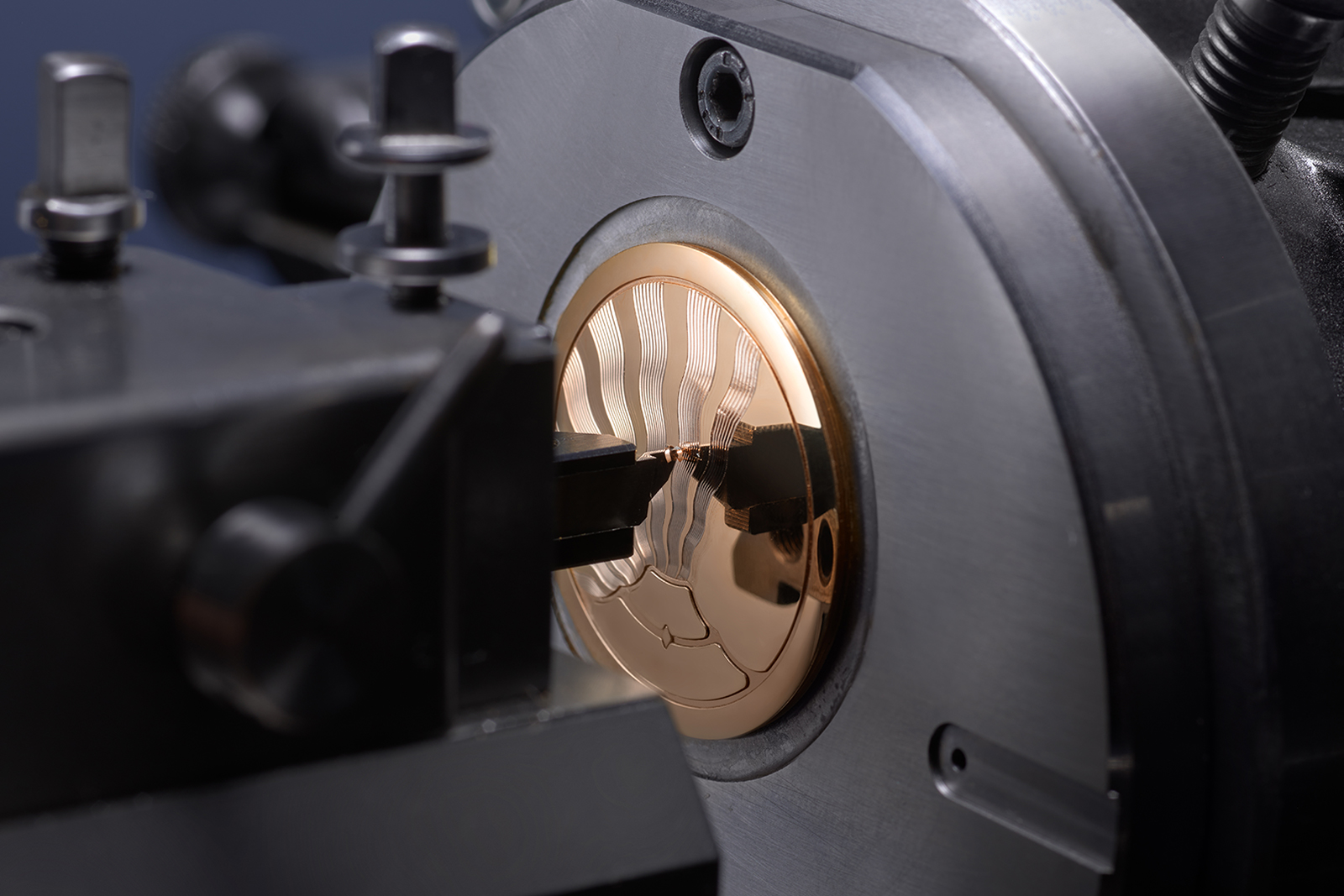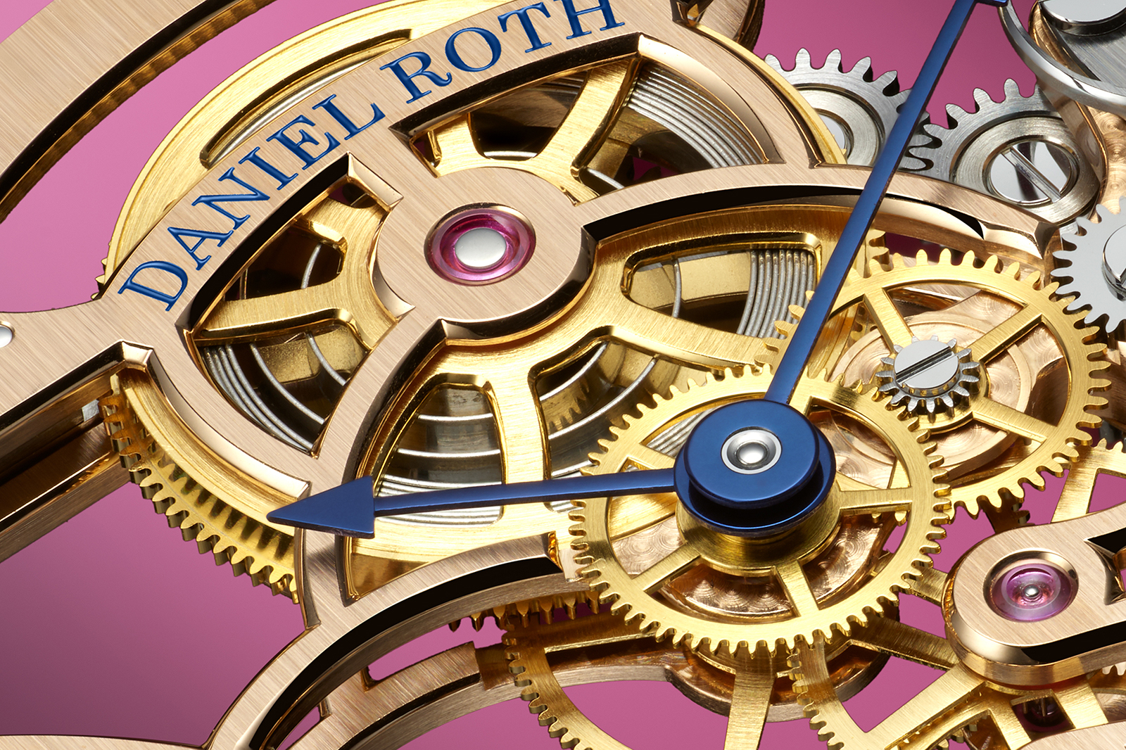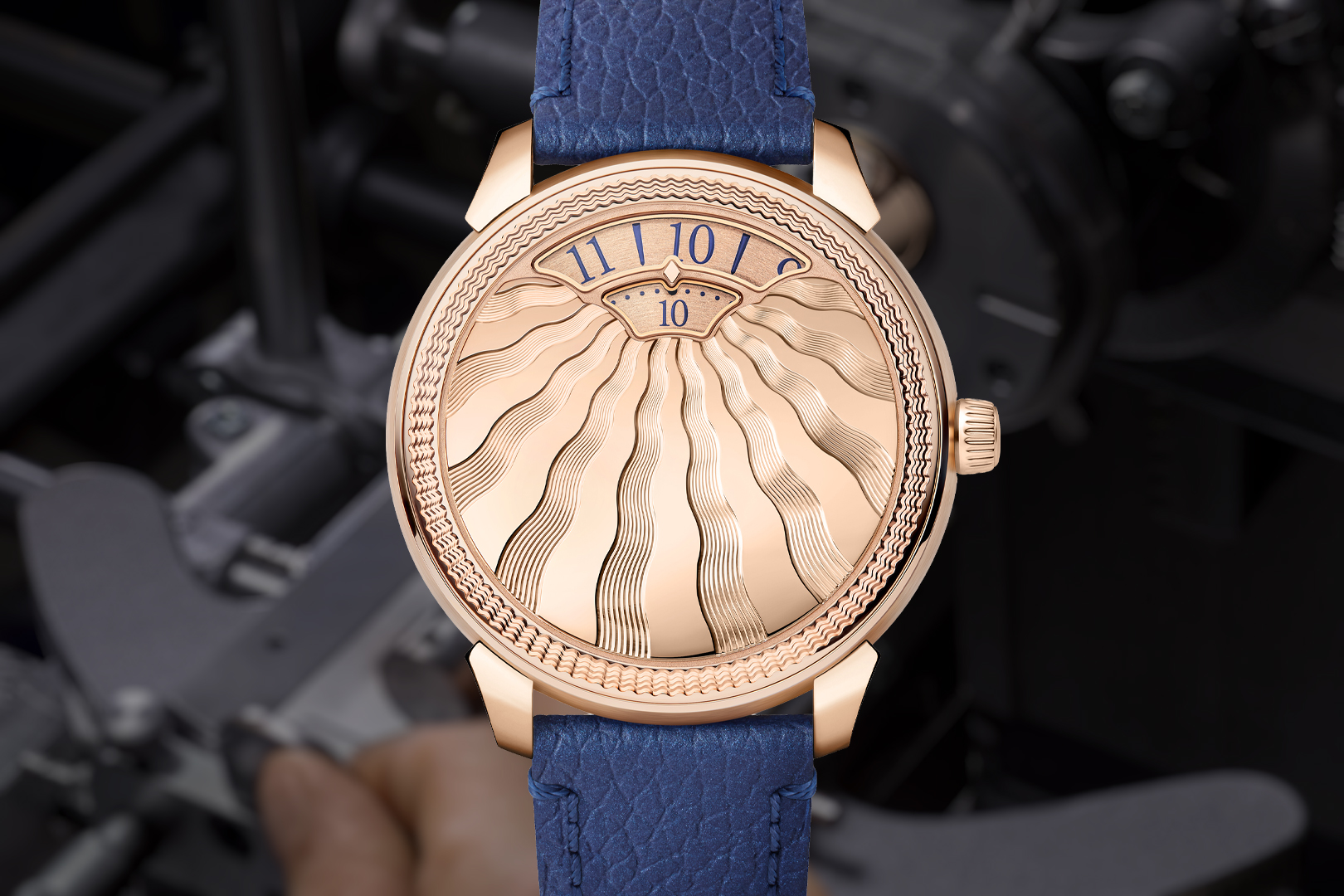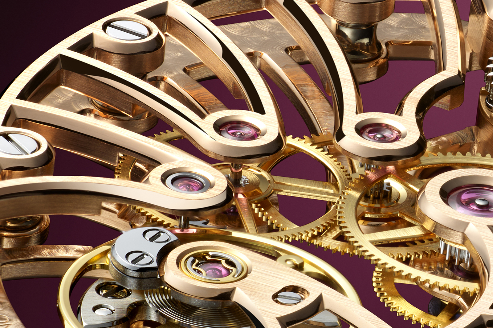 The finishing reinforces the brand’s emerging house style, with frosted plates and colourless sapphire jewels. It also doubles down on the monochromatic look, plating the automatic winding train – which was gilt in the 23 mm movements – in a white metal. The larger footprint also accommodates a larger barrel and extended 62-hour power reserve, charged by a solid 18k rose gold winding mass.