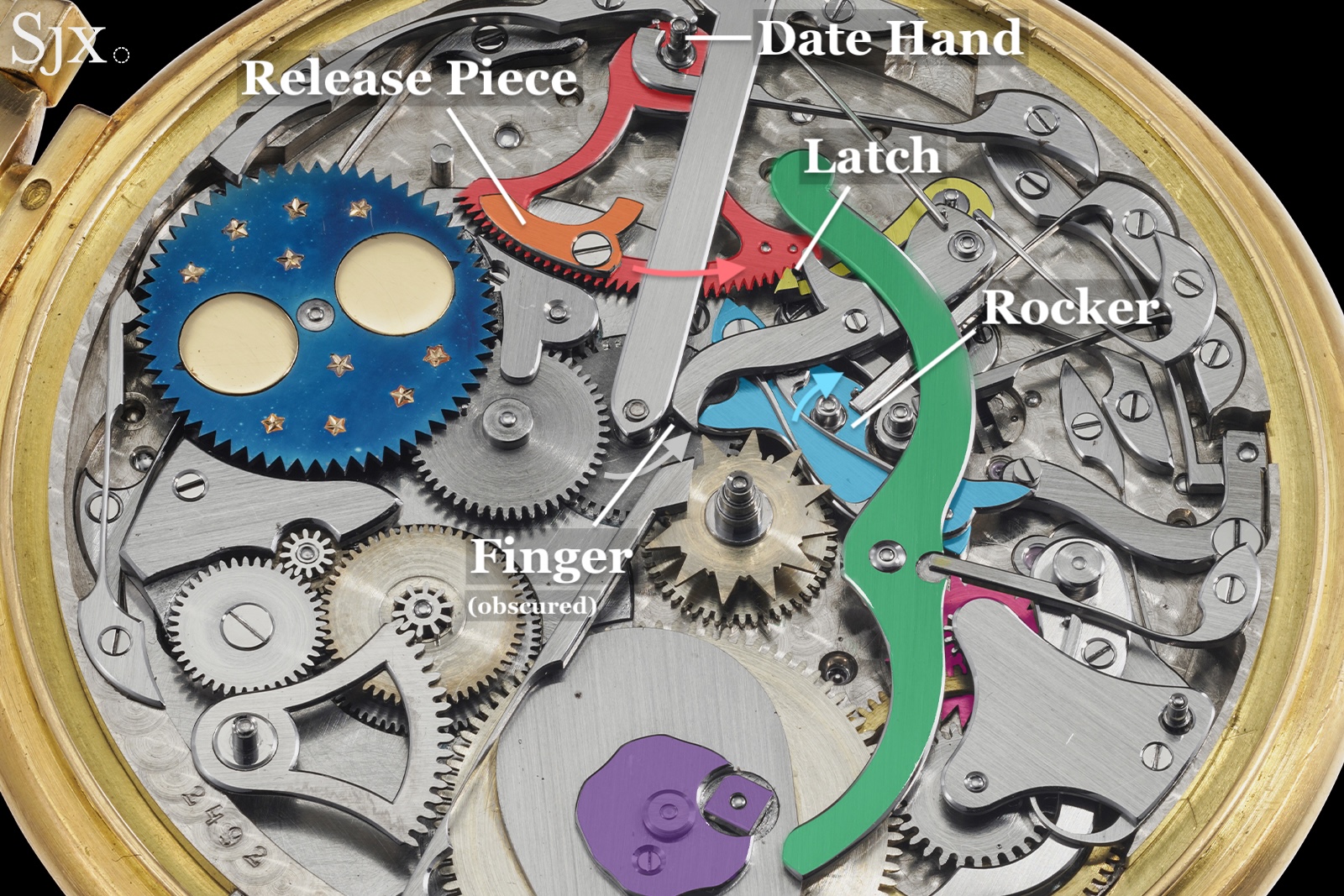 Conceptually this is the same as Breguet’s historic perpetual and annual retrograde calendars. Below are the calendar works of No. 160, showing how similar this watch is to Breguet’s most famous watch, even a hundred years removed. Here, the first wheel of the equation train (magenta) turns counterclockwise and carries pins to actuate the rocker (light blue), a release rocker (dark blue). It also advances a day display (not shown).