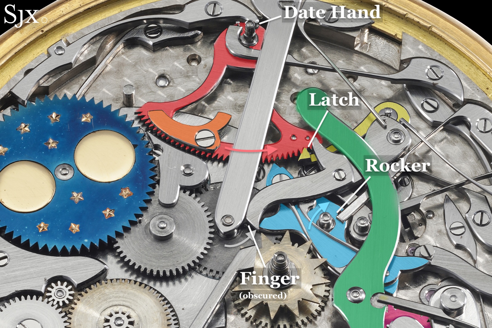 A 31-tooth rack (red) displays the date. The rack is held under tension by a spring, which pushes it to the left. Every 24 hours, a finger causes a rocker (light blue) to pivot slightly, which advances the red rack by one tooth to the right, which is held in place by a latch (yellow).