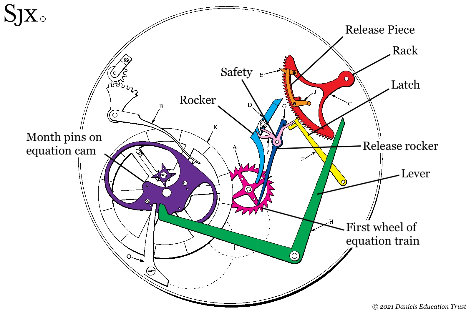 It adds a safety (pink) that blocks the latch (yellow) from being released except when the rocker (light blue) advances the rack. During this window (when the safety is disengaged) on the last day of the month, the release piece (orange) nudges the latch (yellow) just enough for the release rocker (dark blue) to grab it, and hold it in the released state. This allows the rack to return to the first of the month once the rocker (light blue) is no longer acting on it. Finally, a pin on the first wheel of the equation train (magenta) pivots the release rocker (dark blue), which lets go of the latch, allowing it to fall back into place.